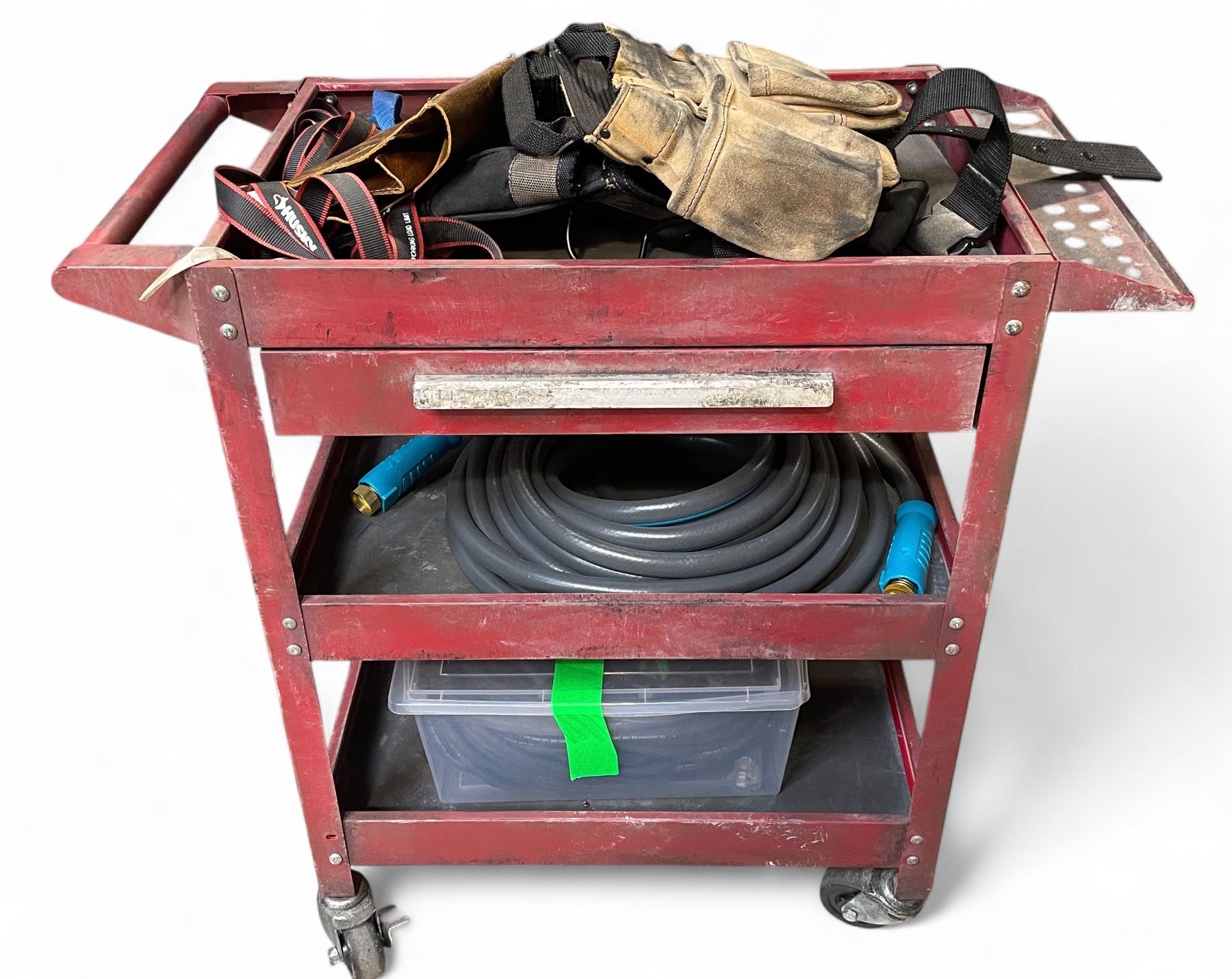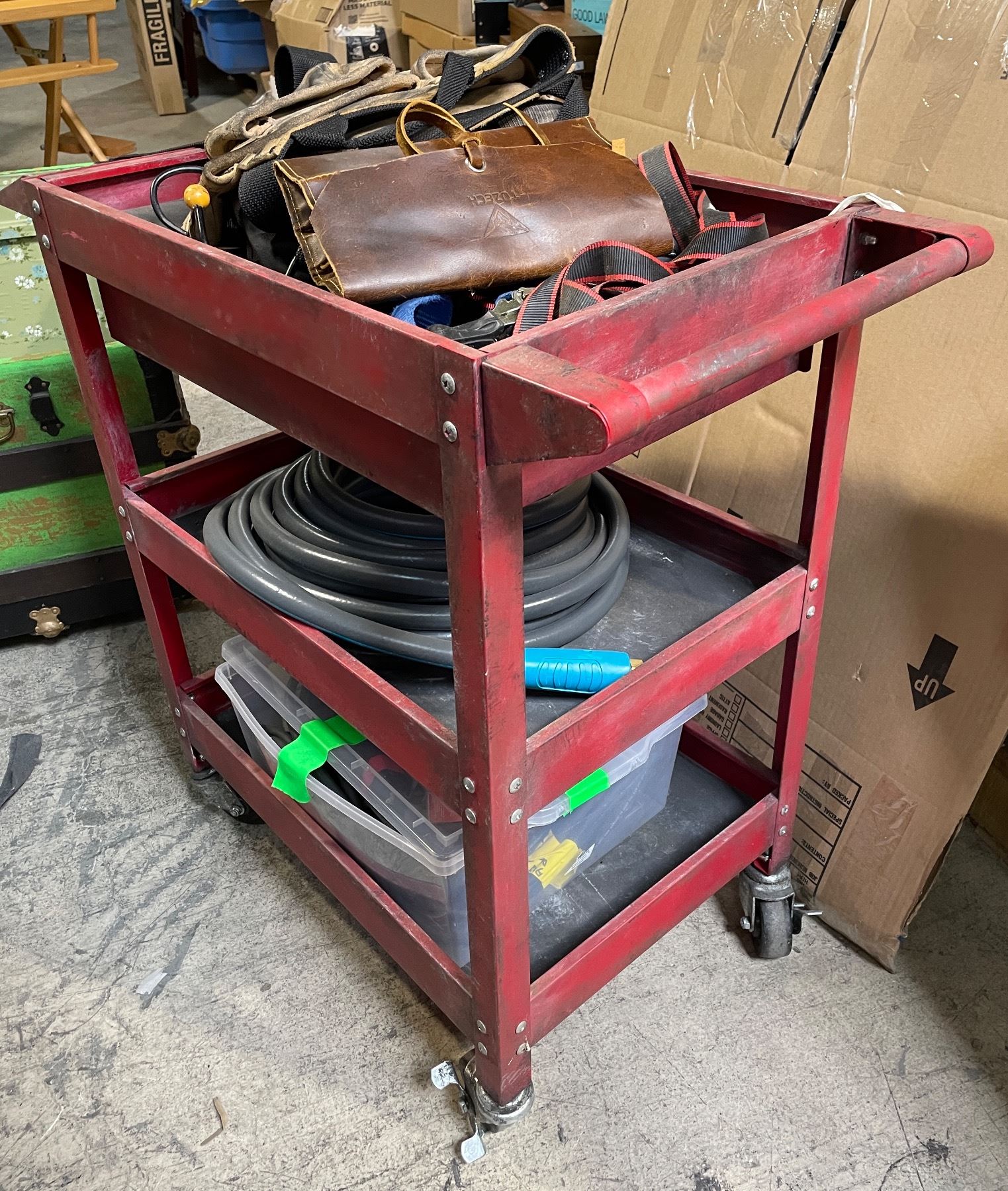 Red Rolling Tool Cart with Assorted Straps, Leather Pouch, and Coiled Hose