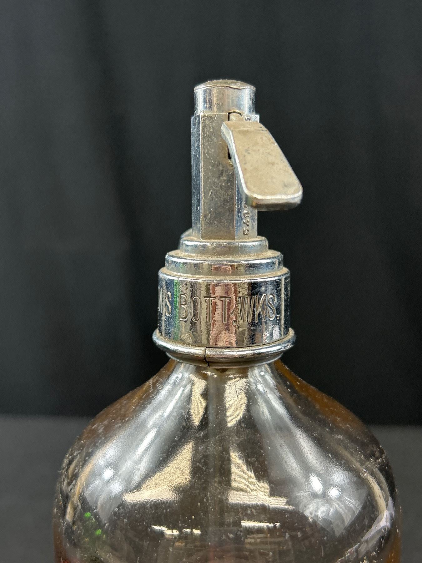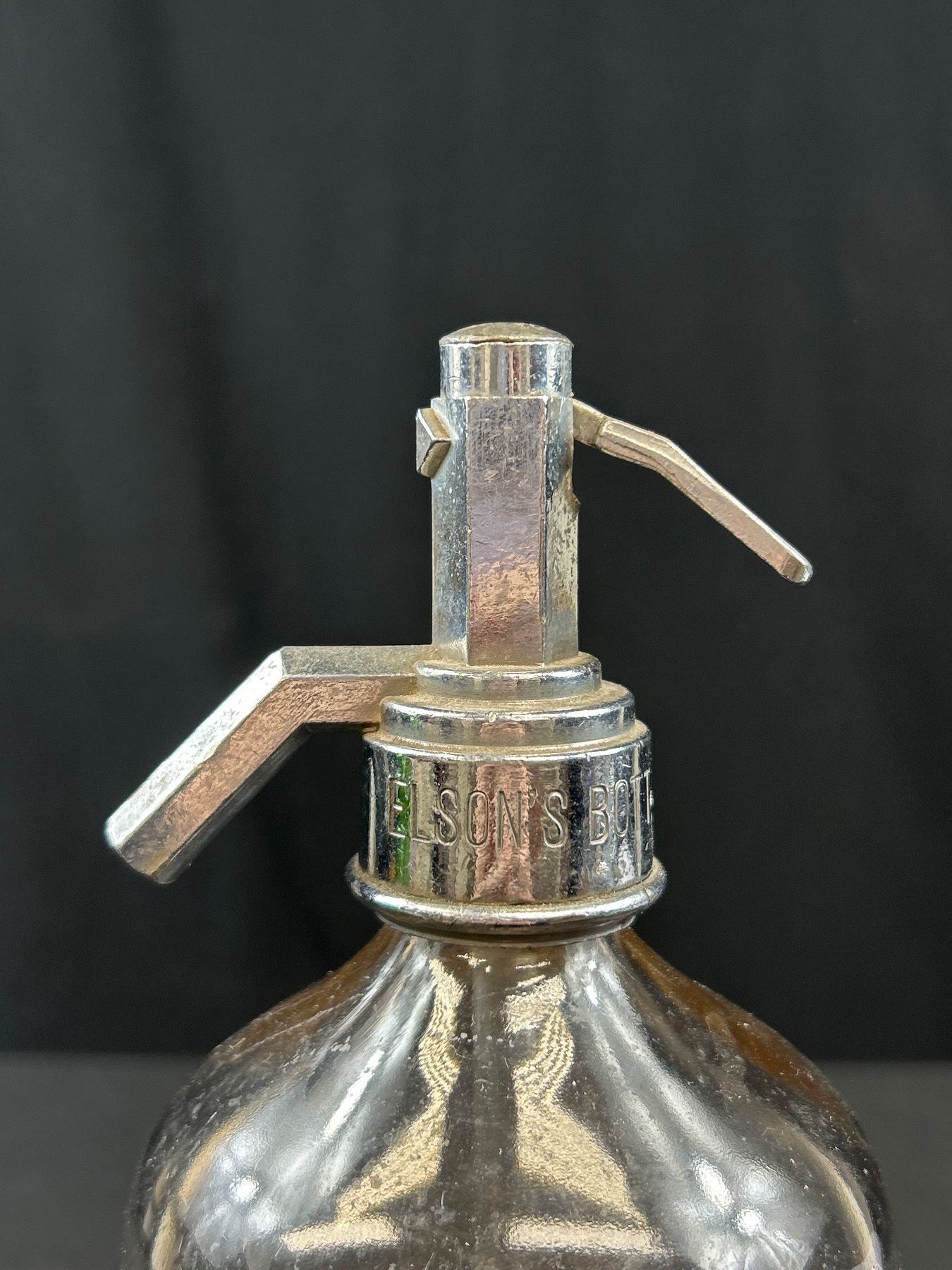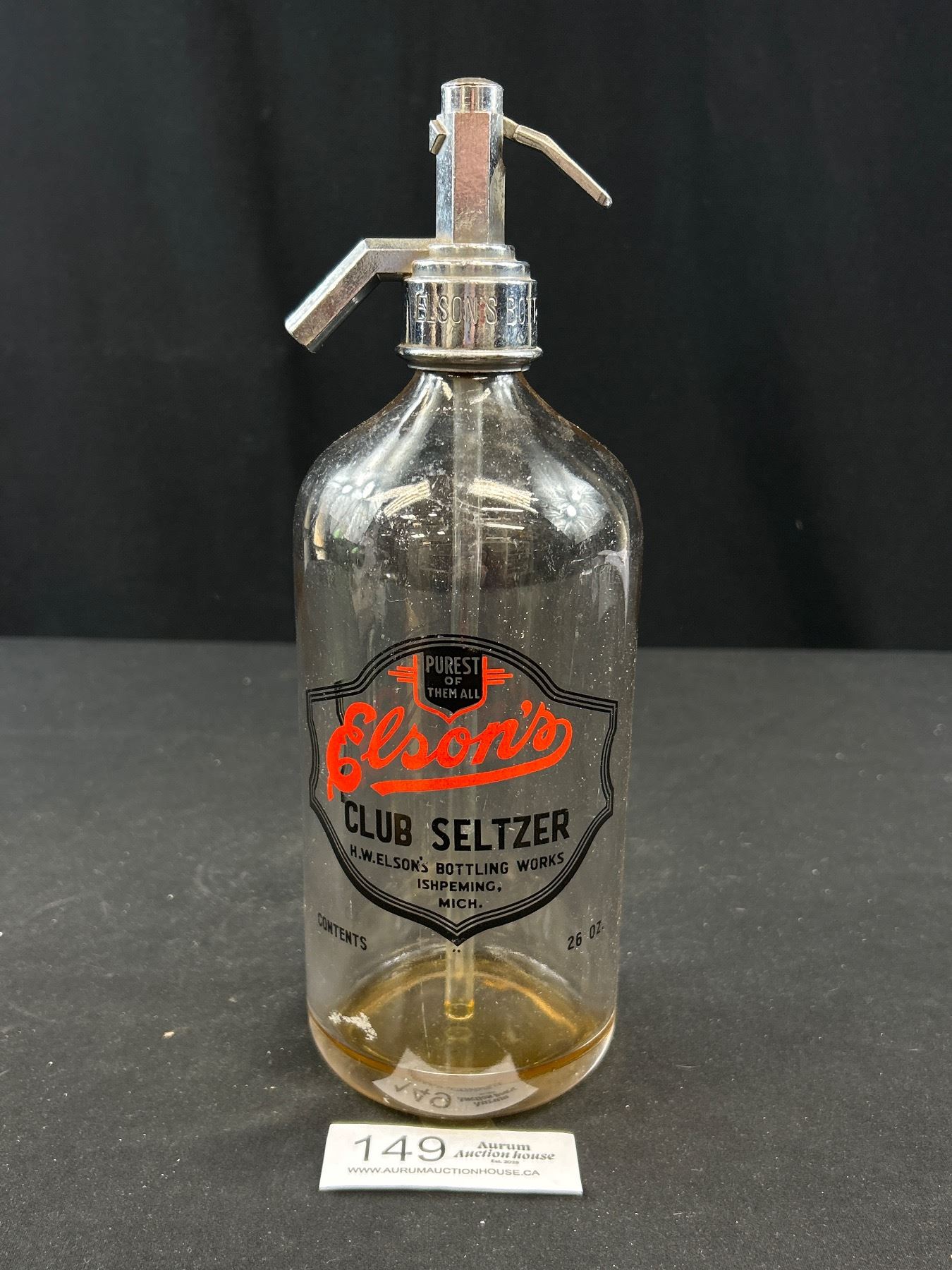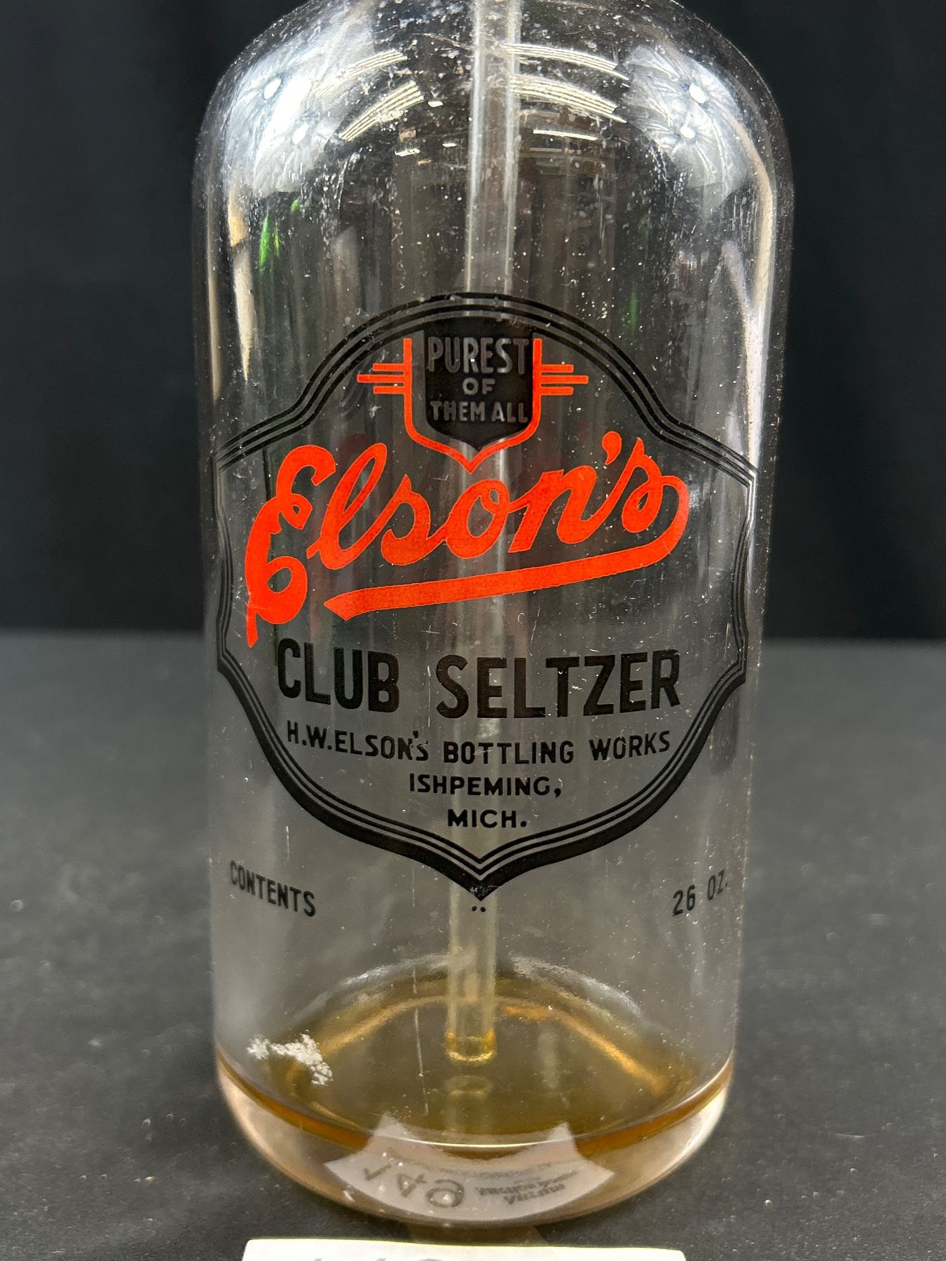 Red and Black Labeled Elsons Club Seltzer Michagan Seltzer Bottle