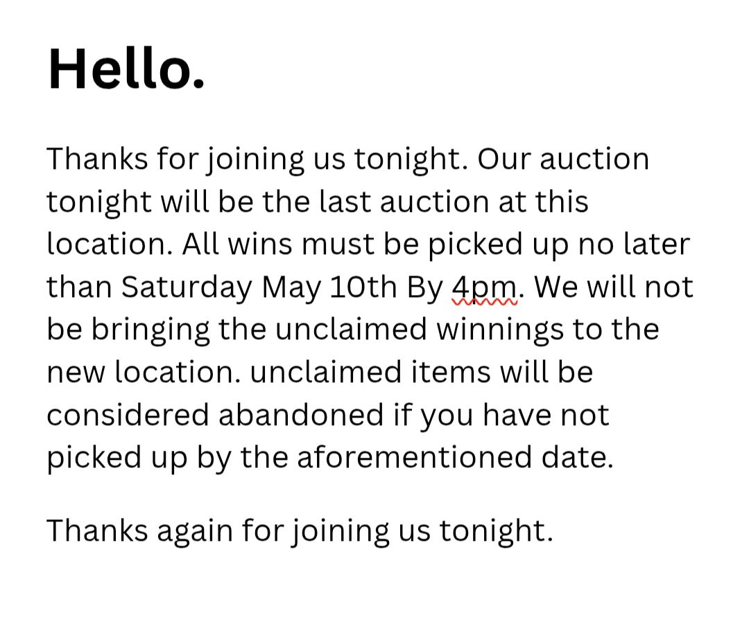ITEMS NOT PICKED UP DURING THIS TIME WILL BE CONSIDERED ABANDONED AND NO REFUNDS GIVEN UNLESS YOU HAVE MADE OTHER ARRANGEMENTS FOR PICK UP