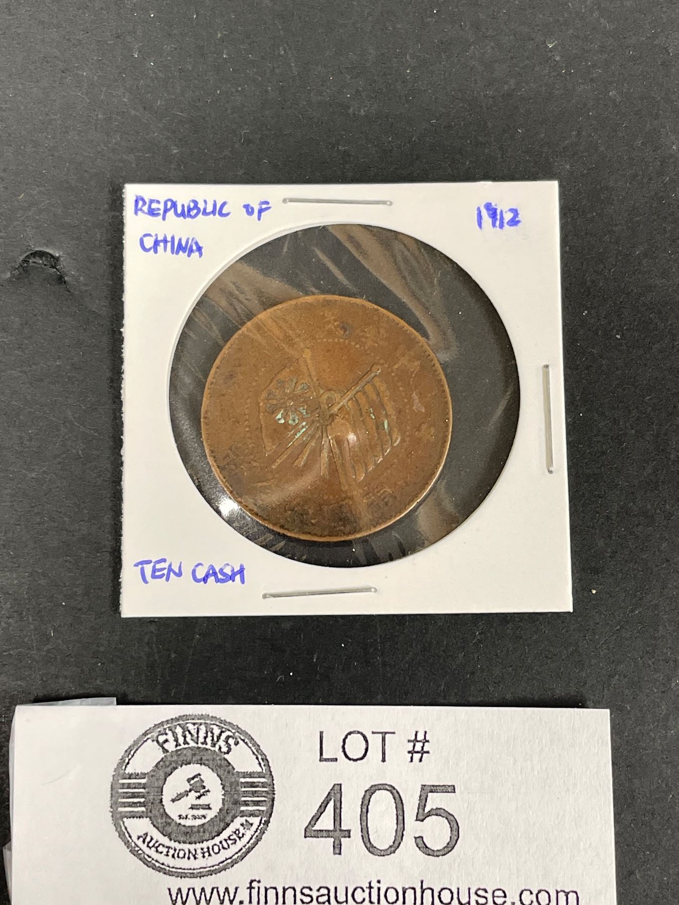 Republic of China Year 1 1912 Ten Cash Copper Coin, Two Flags on One Side, Chinese "Ten Cash" with Punch In Center of the Other Side