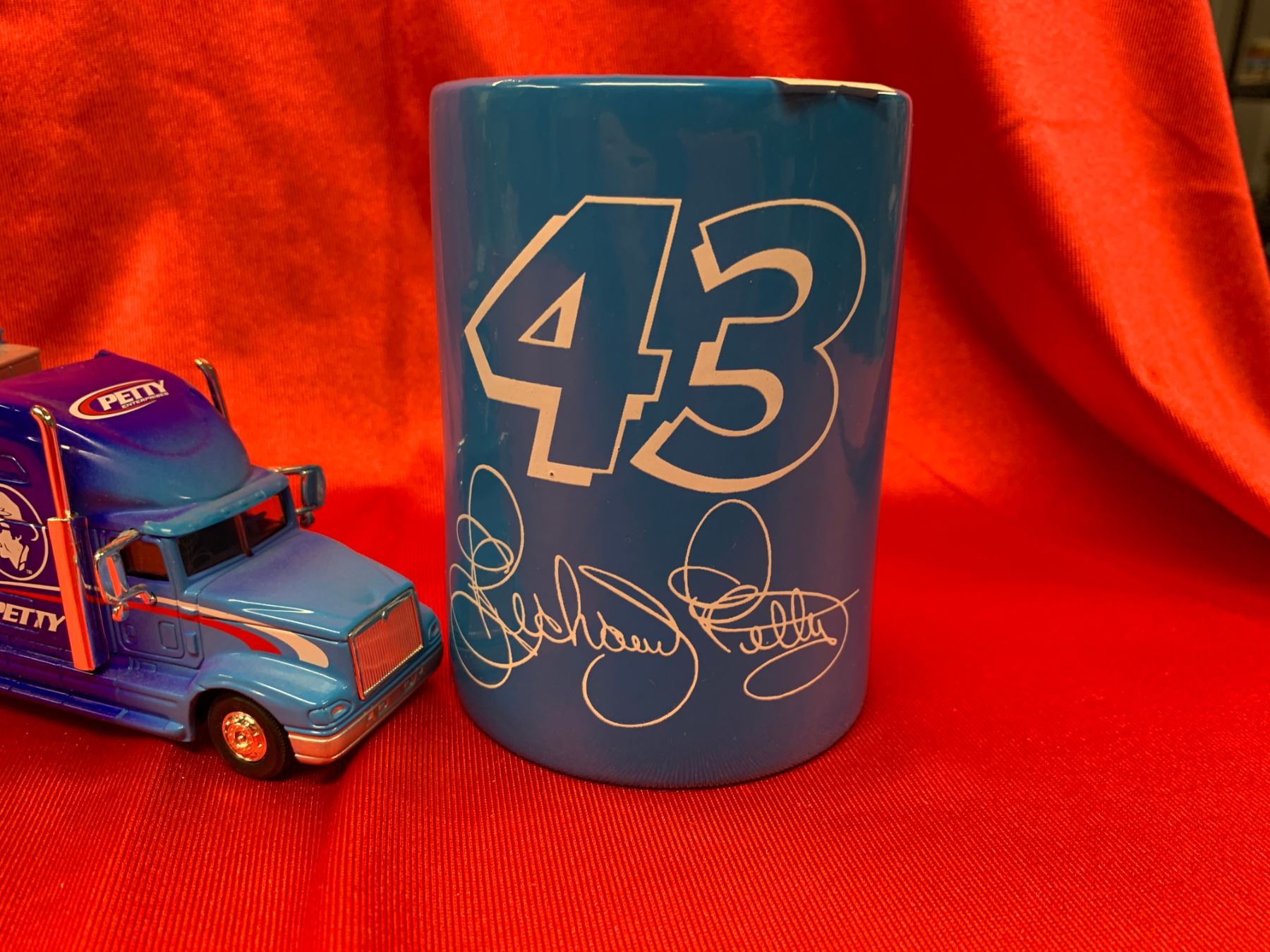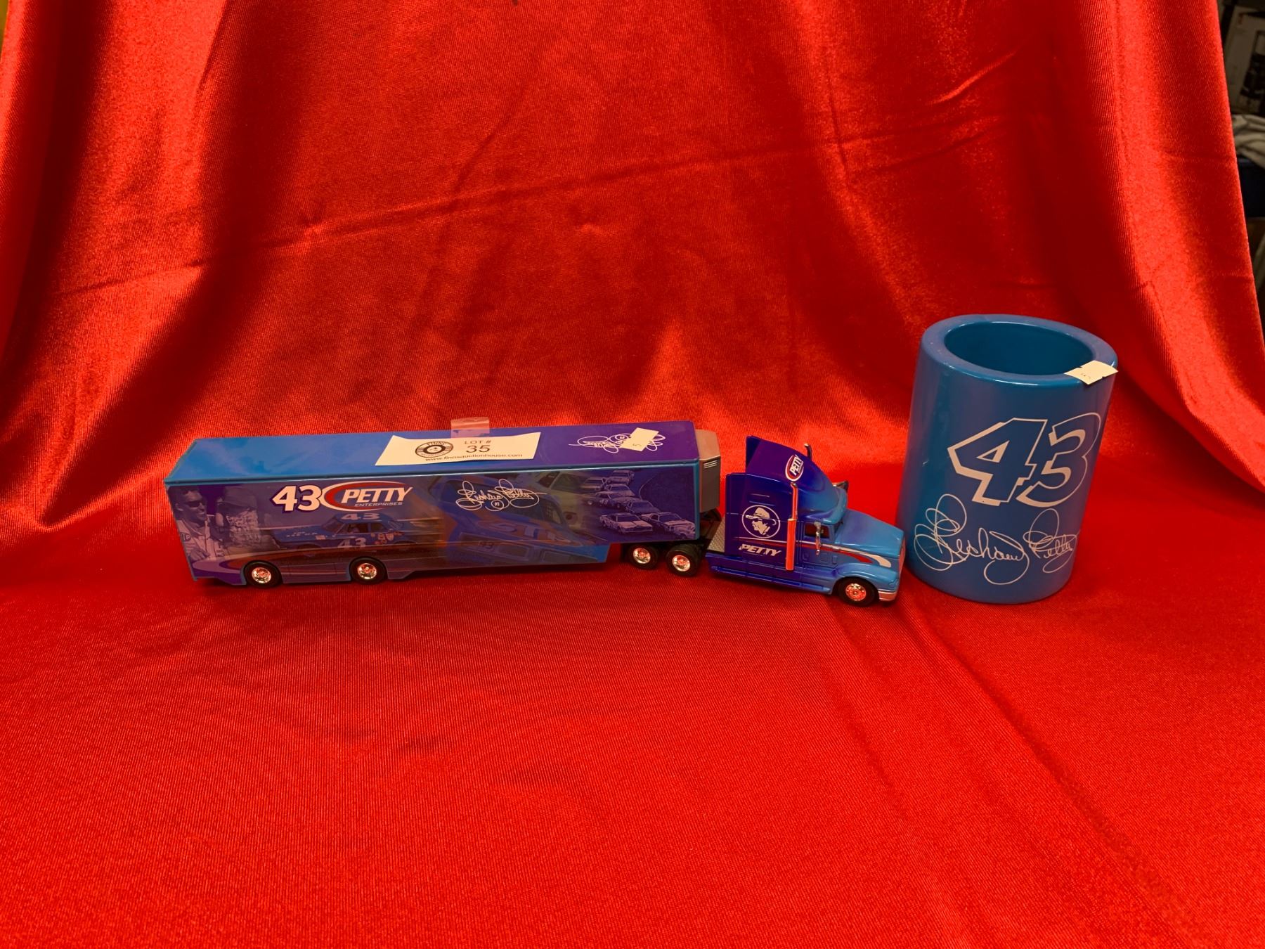 Richard Petty Number 43 Cupholder. Styrofoam Plus a Richard Petty Semi Truck and Trailer