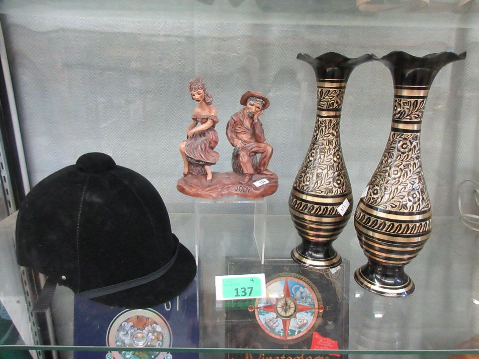 Riding Helmet, Figurine, & Pair of 12  Metal Vases