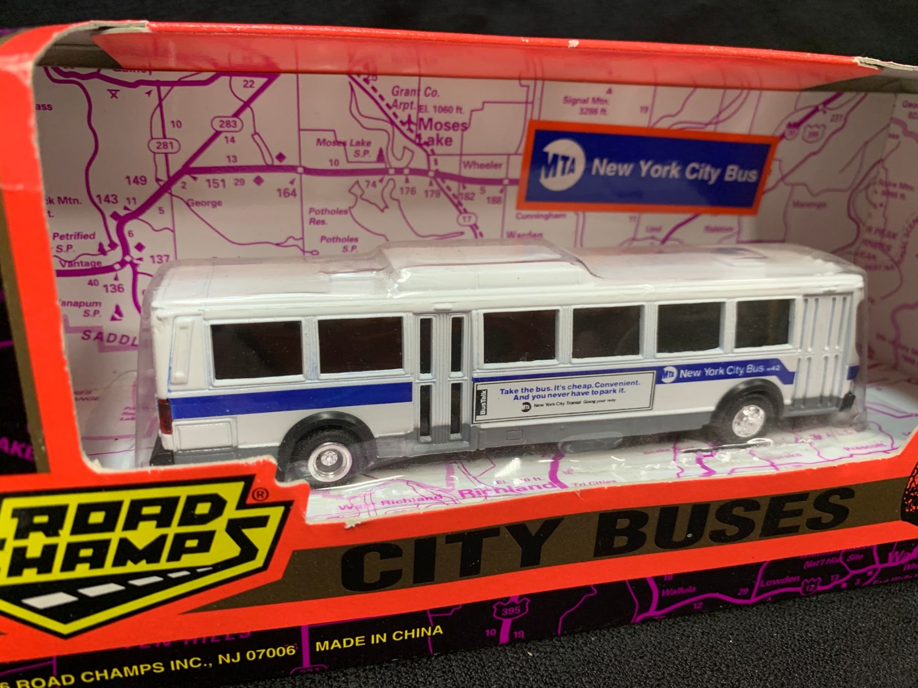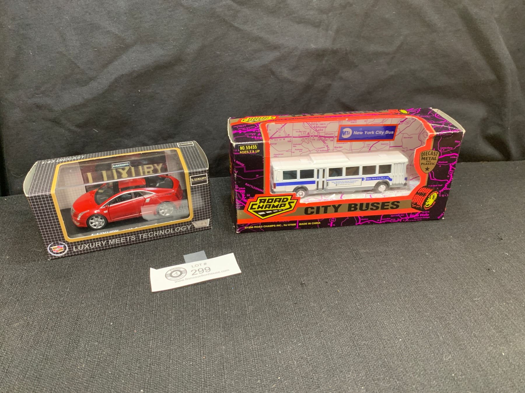Road ChampsDie Cast City Bus.and a 1/43 Scale Cadillac Die Cast Car