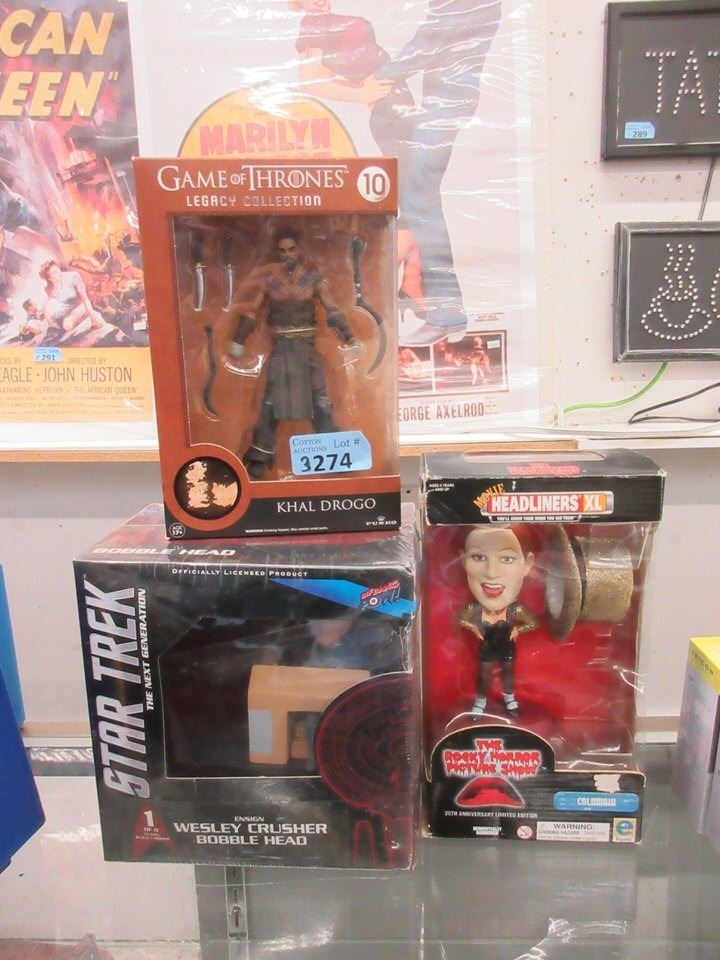 Khal Drogo Figurine, Wesley Crusher Bobble Head, and Rocky Horror Columbia figurine.