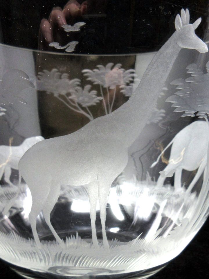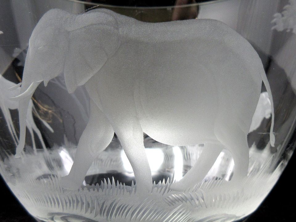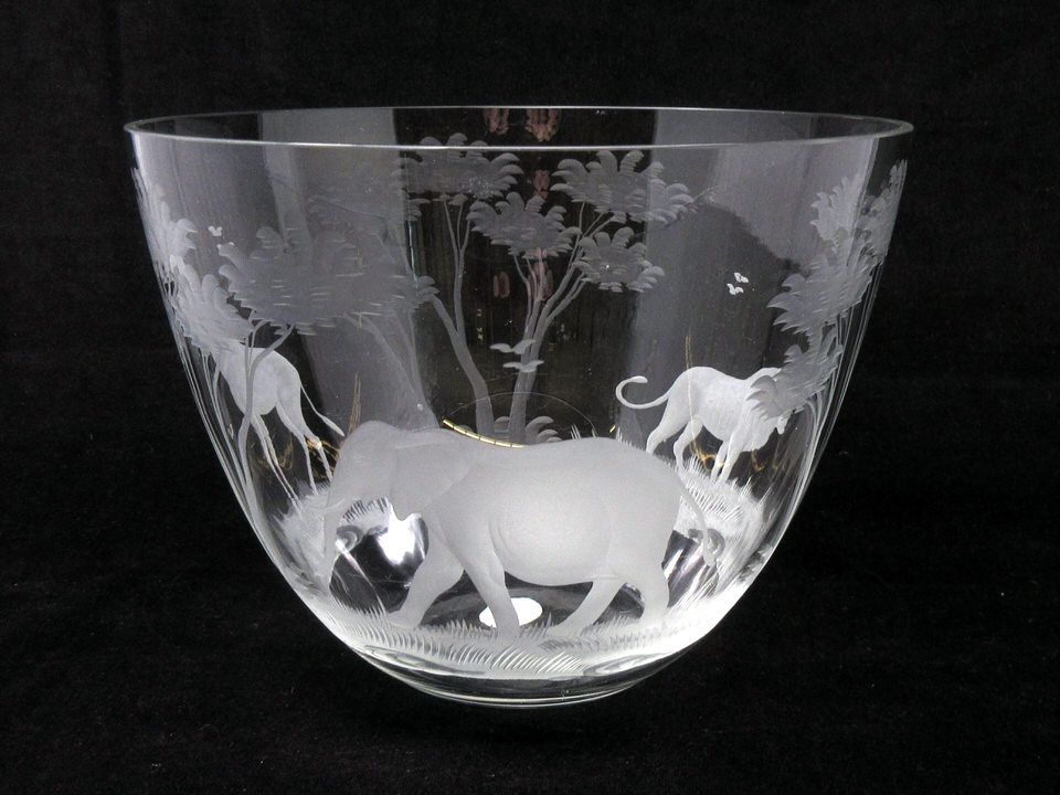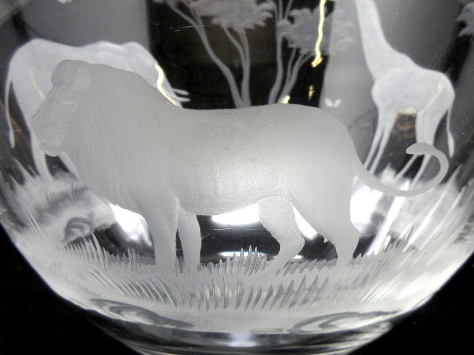 Engraved clear glass bowl of circular tapering form, decorated with lion, elephant and giraffe in an African landscape, diameter 22.2cm, height 16.8cm.