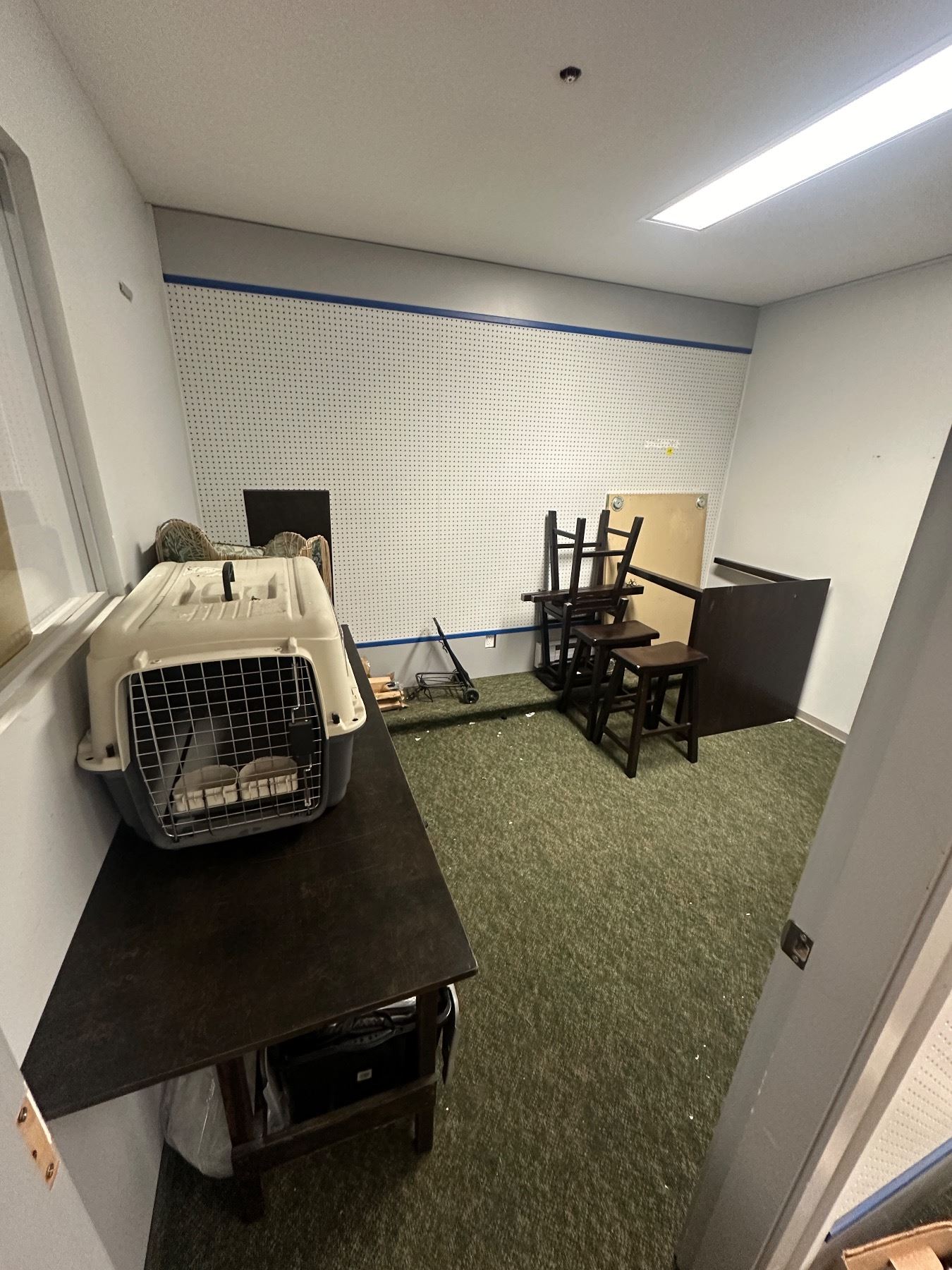 Room lot of misc items including - pet kennel, bar stools, wood table, barrel, fur, misc bags, lamp - clean up auction moving auction
