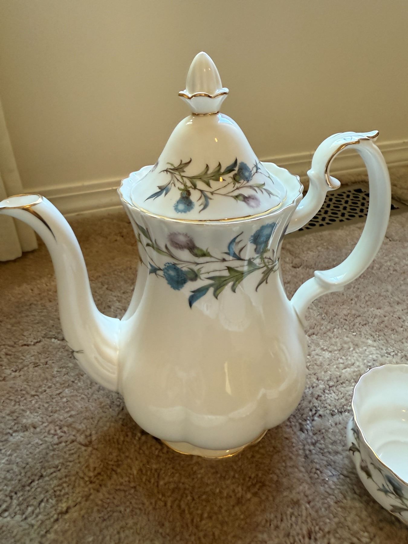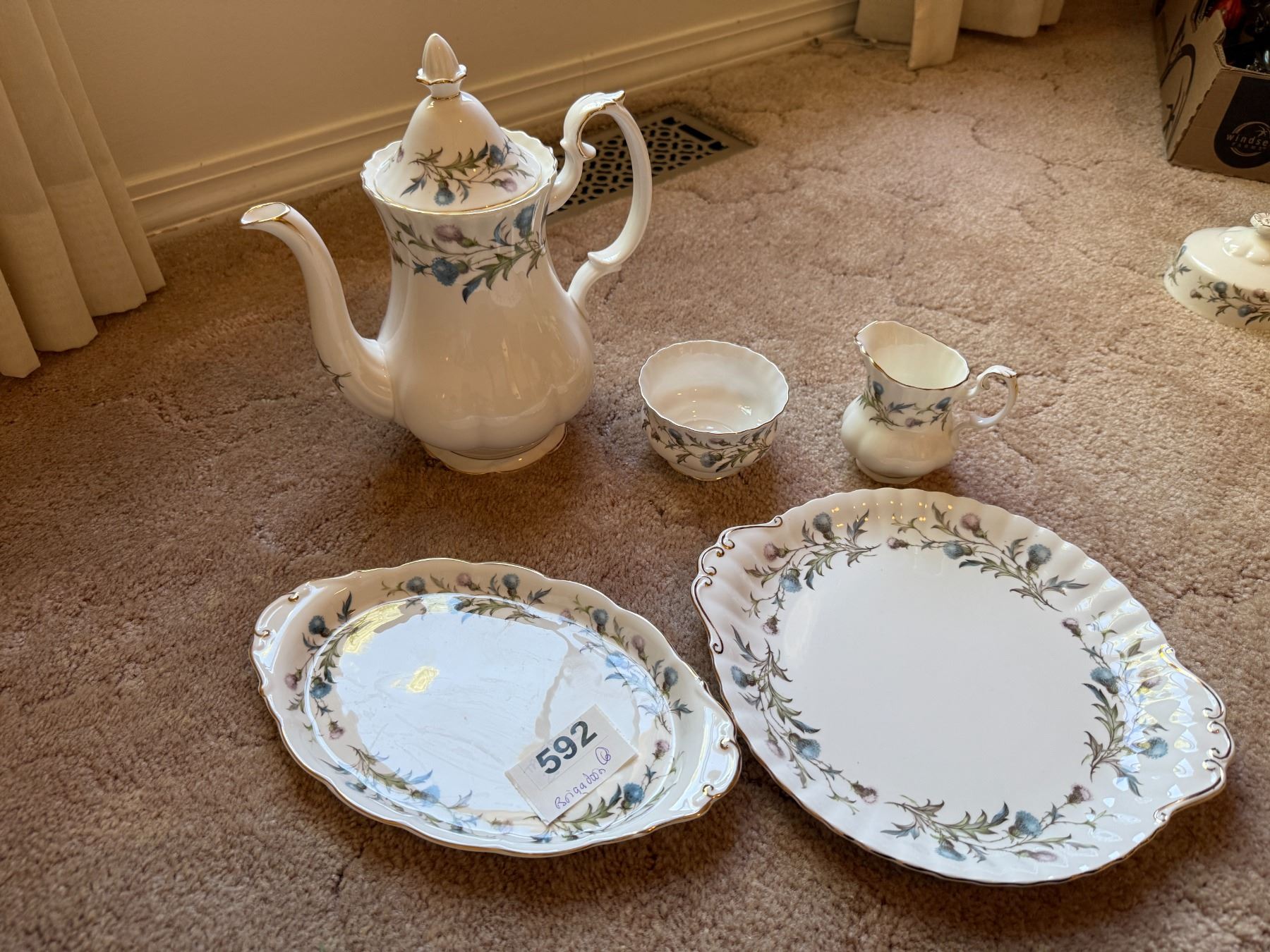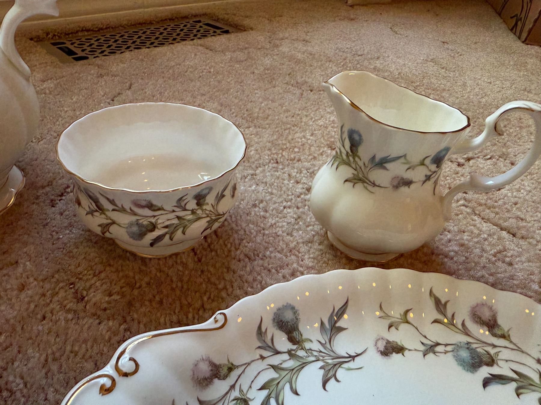 Teapot with lid, sugar and creamer, serving dishes. In bedroom 2.