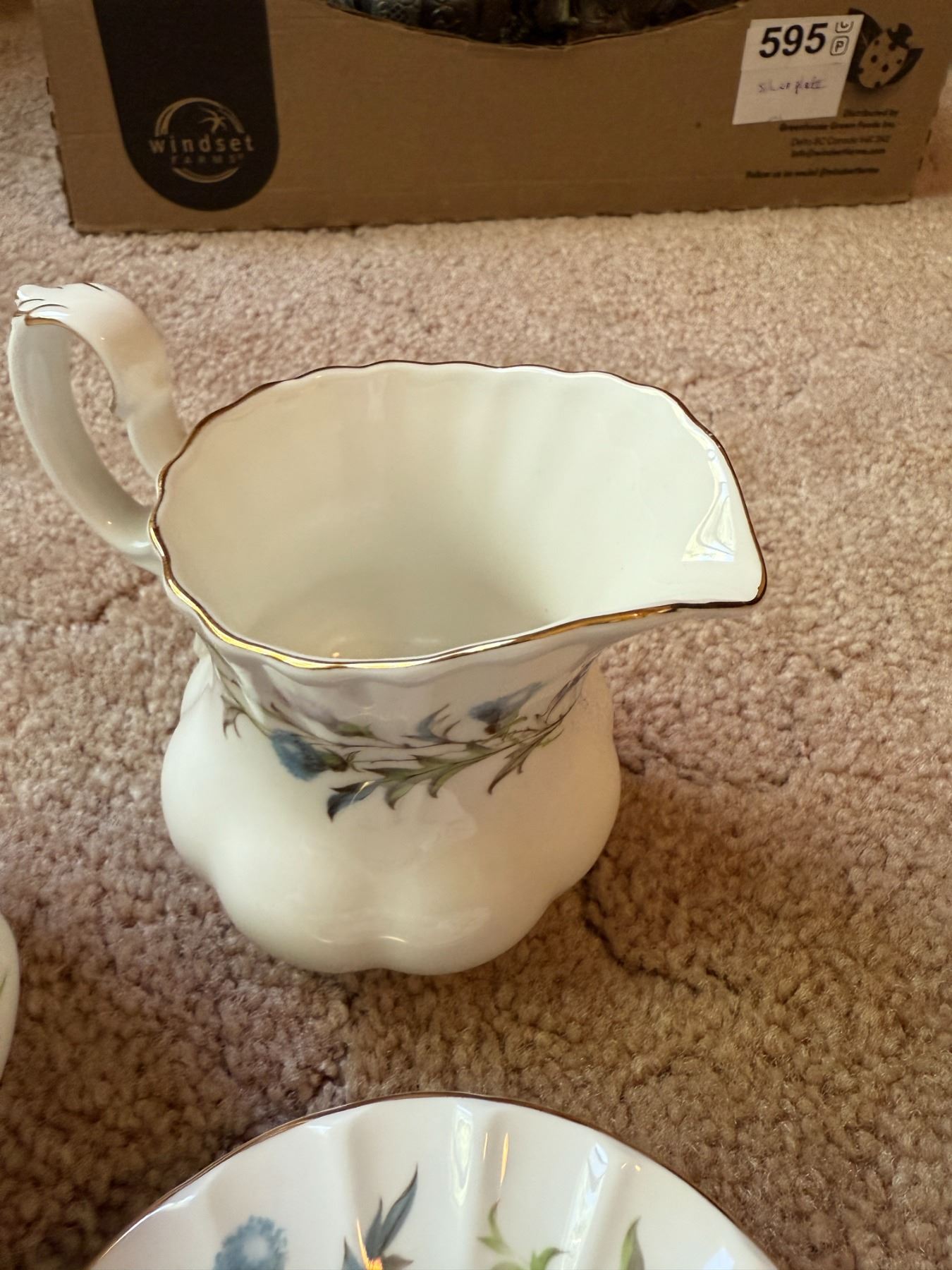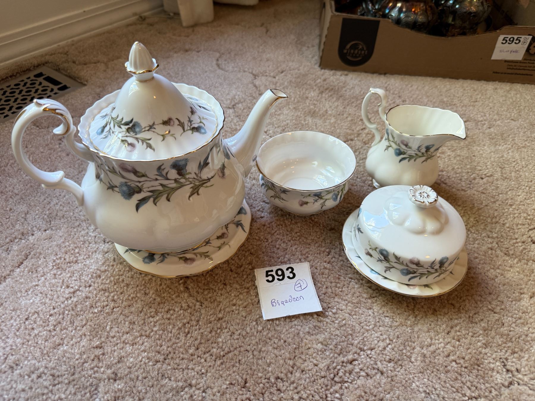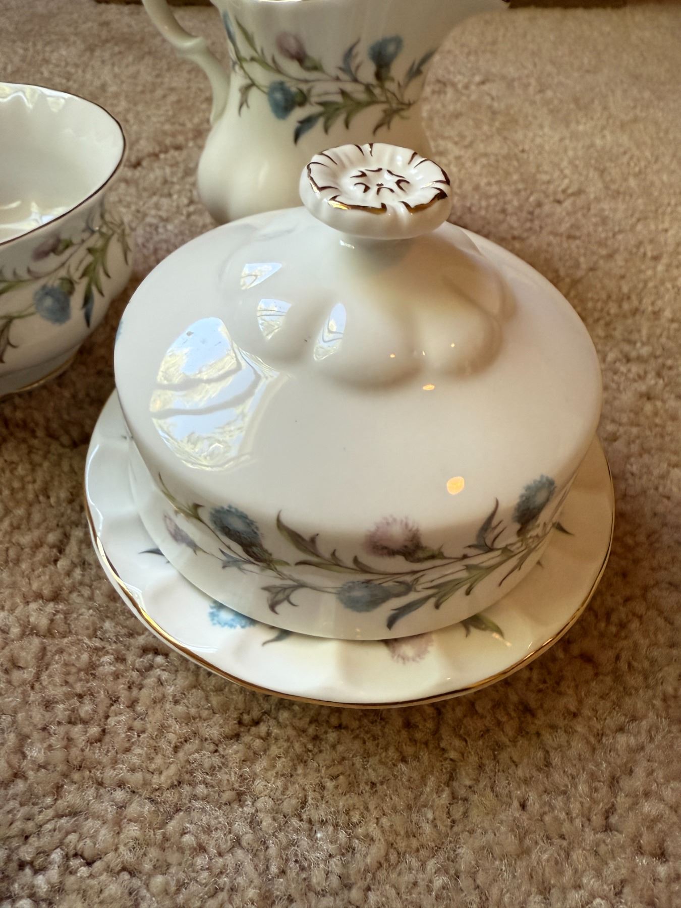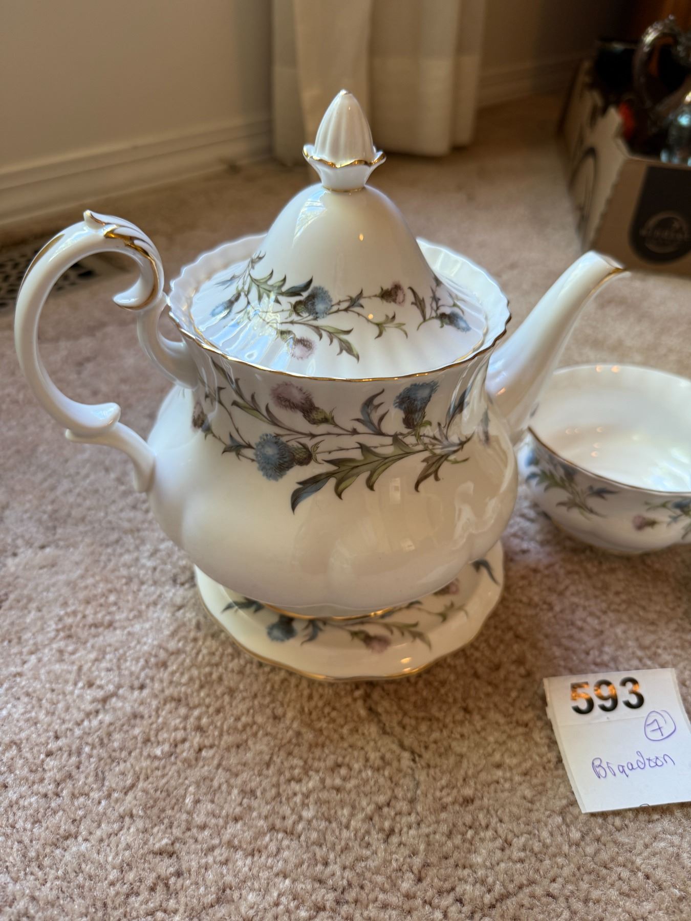 Teapot with lid, sugar and creamer, trivet, other dish/lid. In bedroom 2.