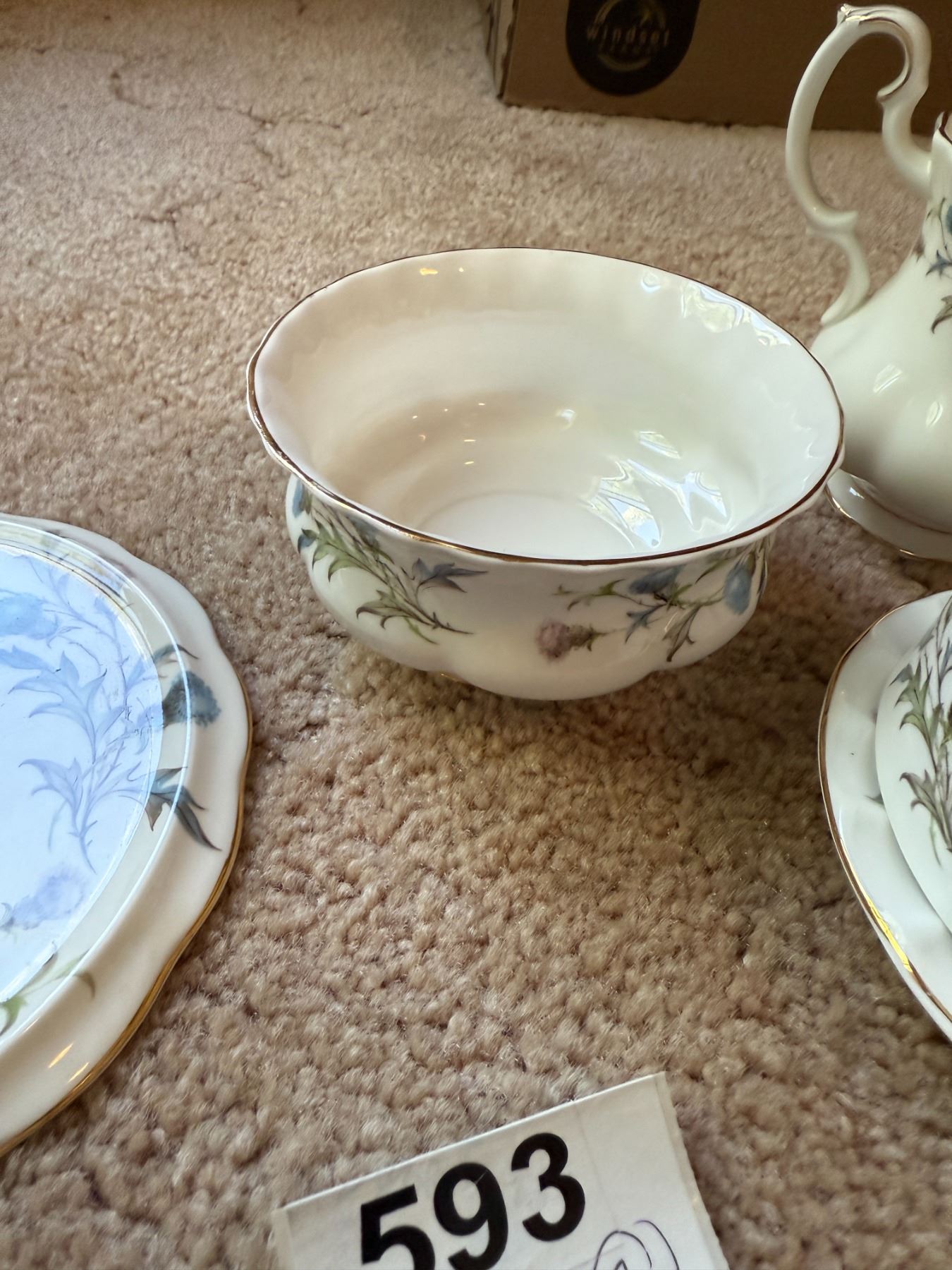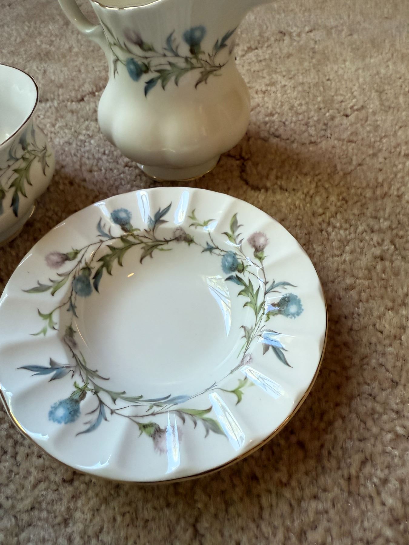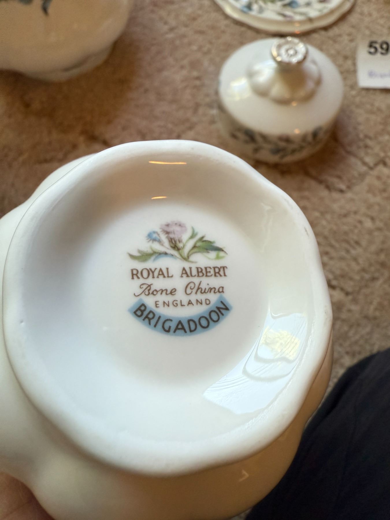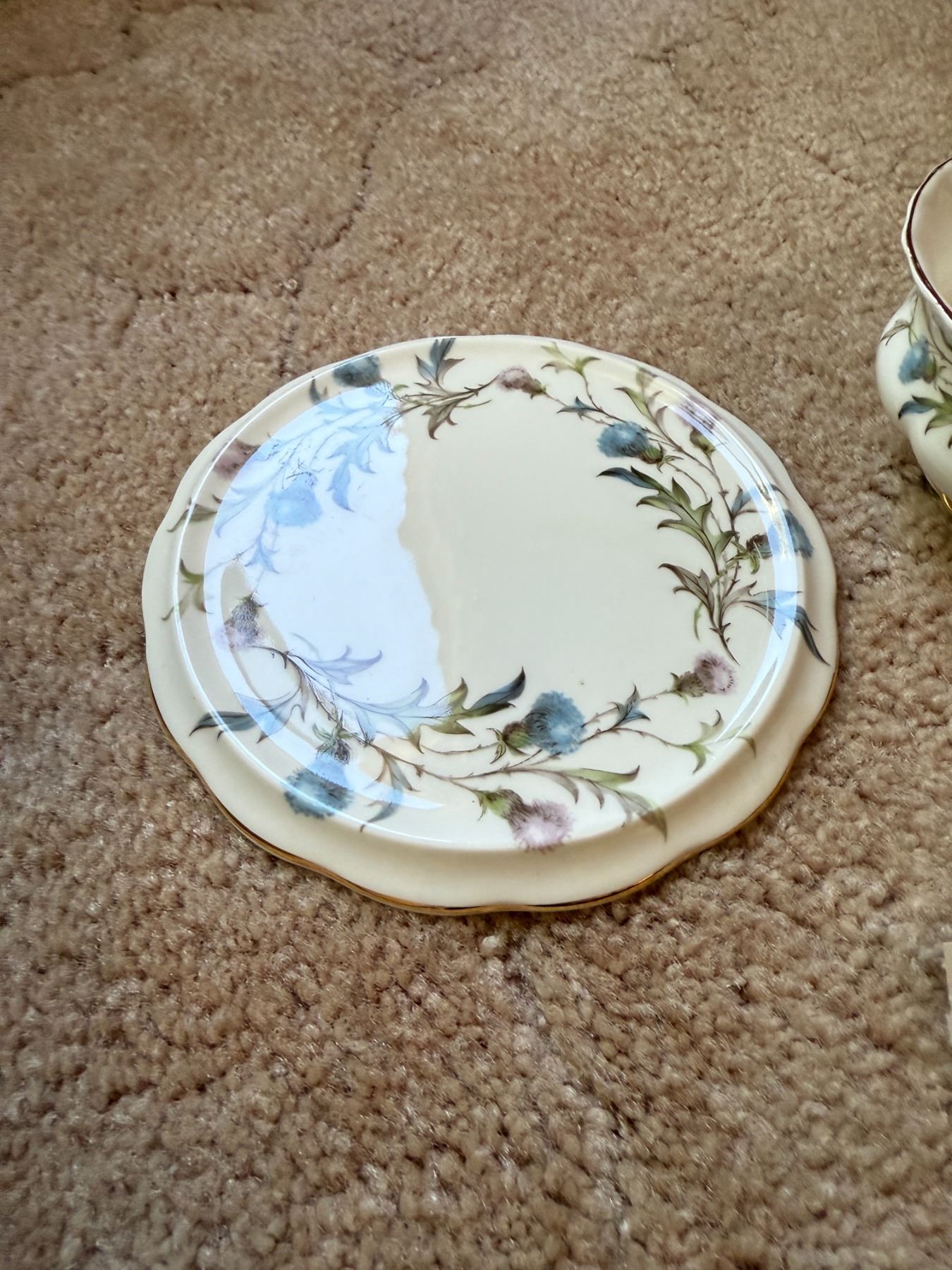 Teapot with lid, sugar and creamer, trivet, other dish/lid. In bedroom 2.
