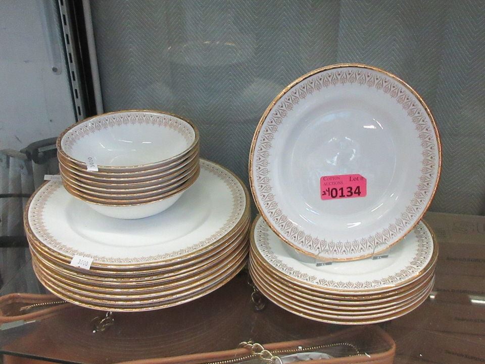 Eight 10" plates, eight 8" plates and eight 6.5" bowls. White with gold scroll edge.