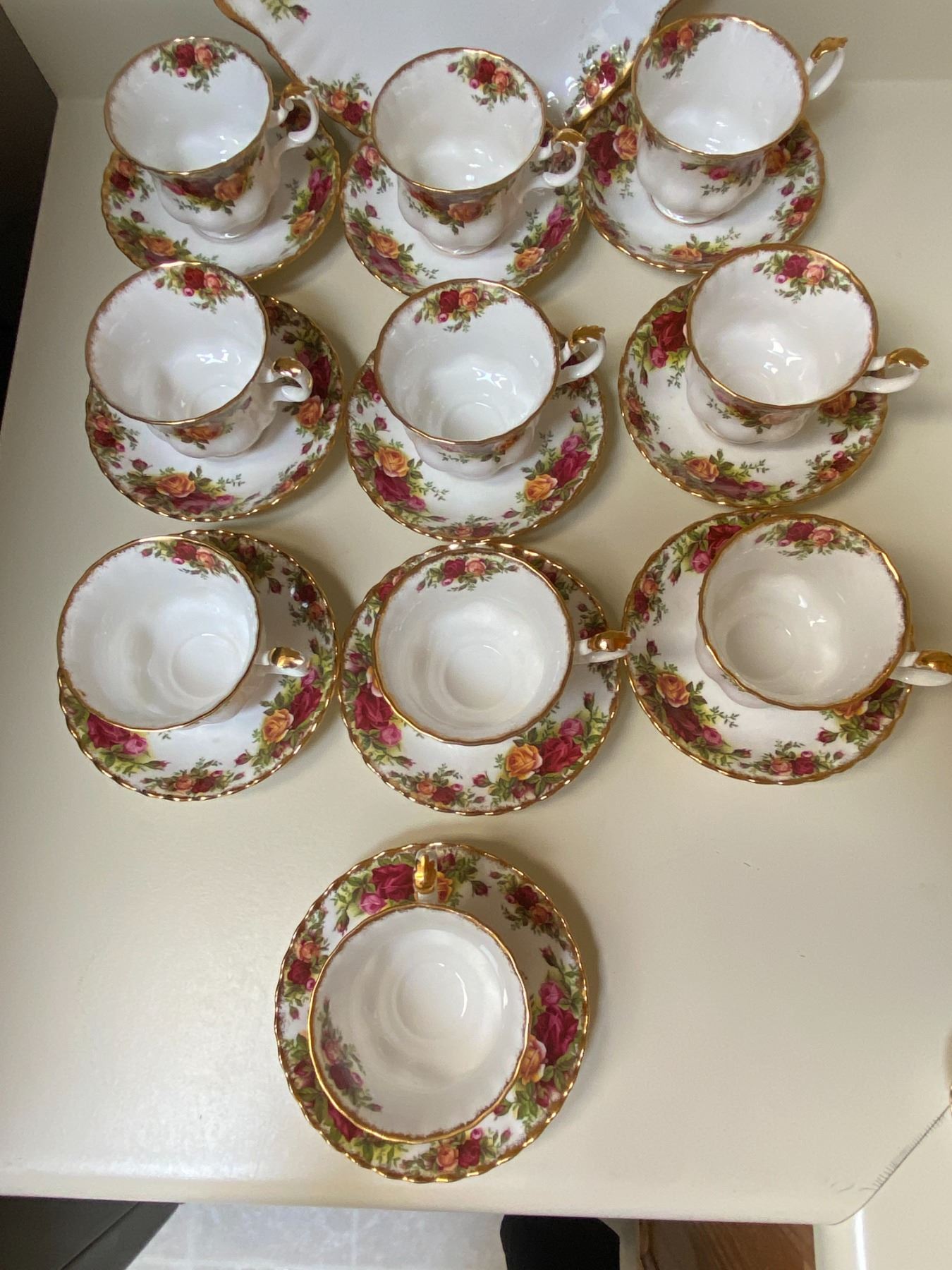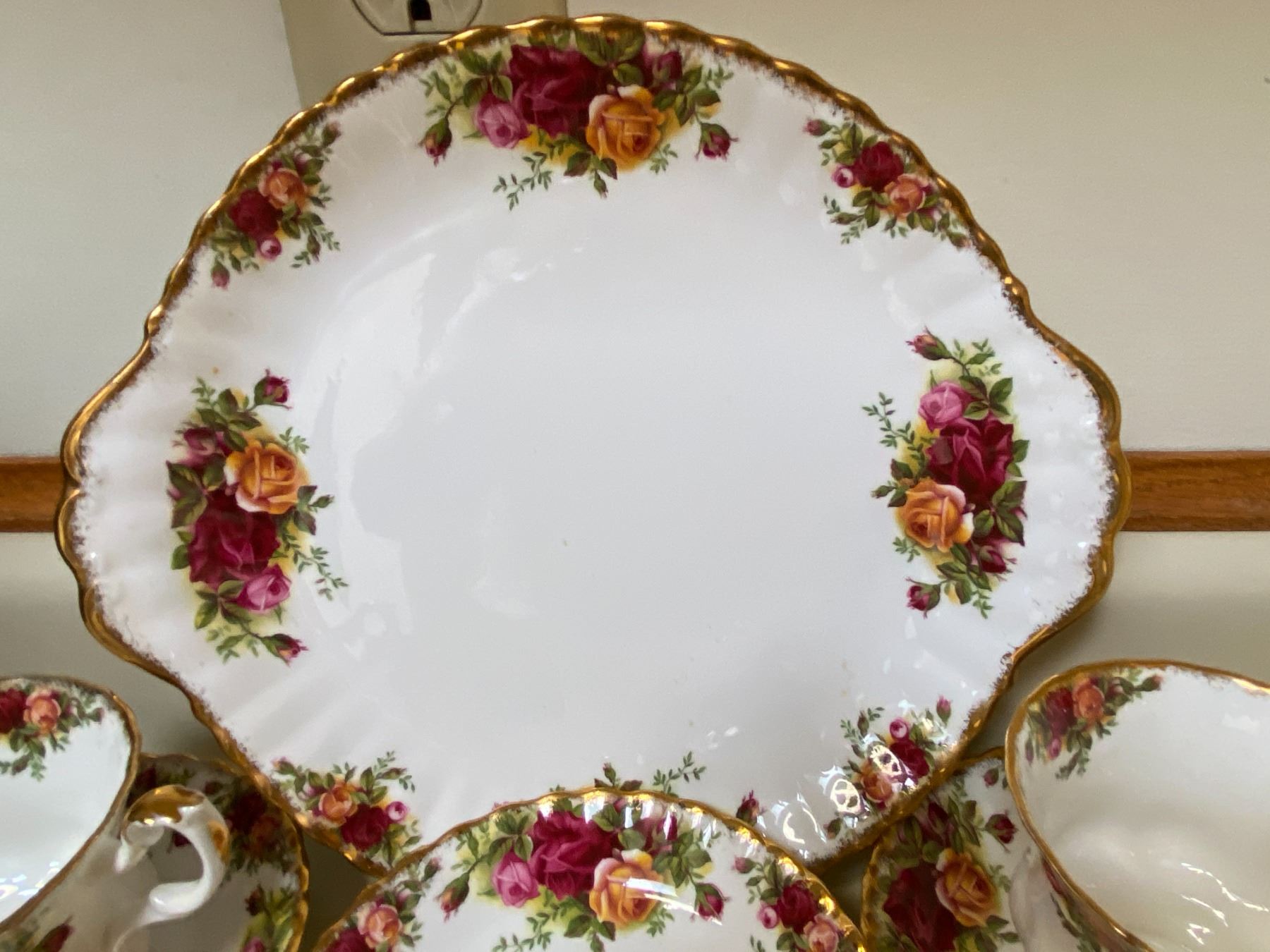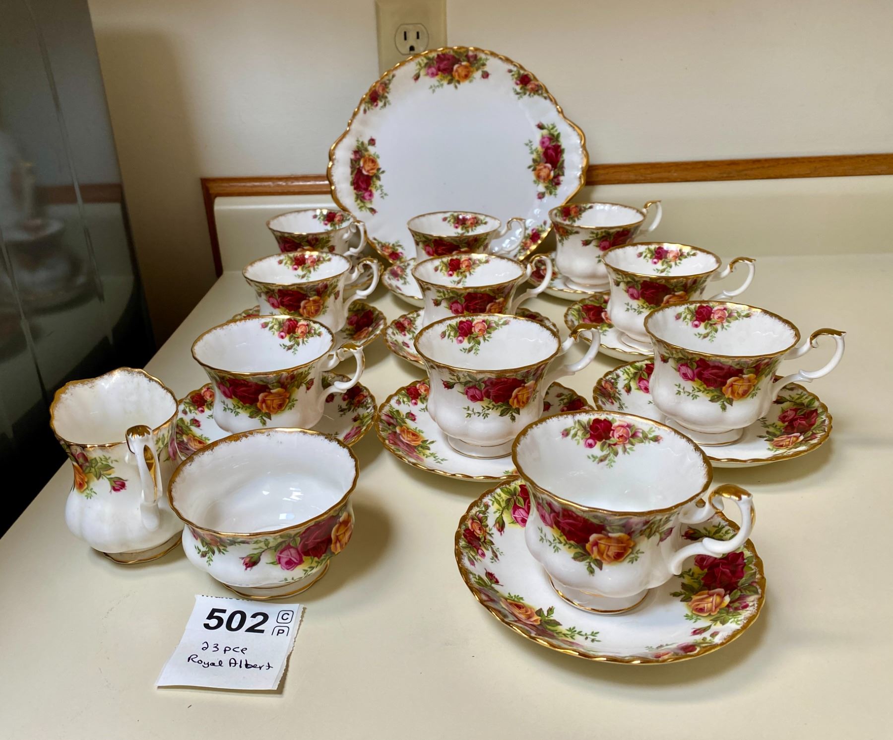 23 pieces of Royal Albert teacups, saucers, serving dish, creamer and sugar bowl.