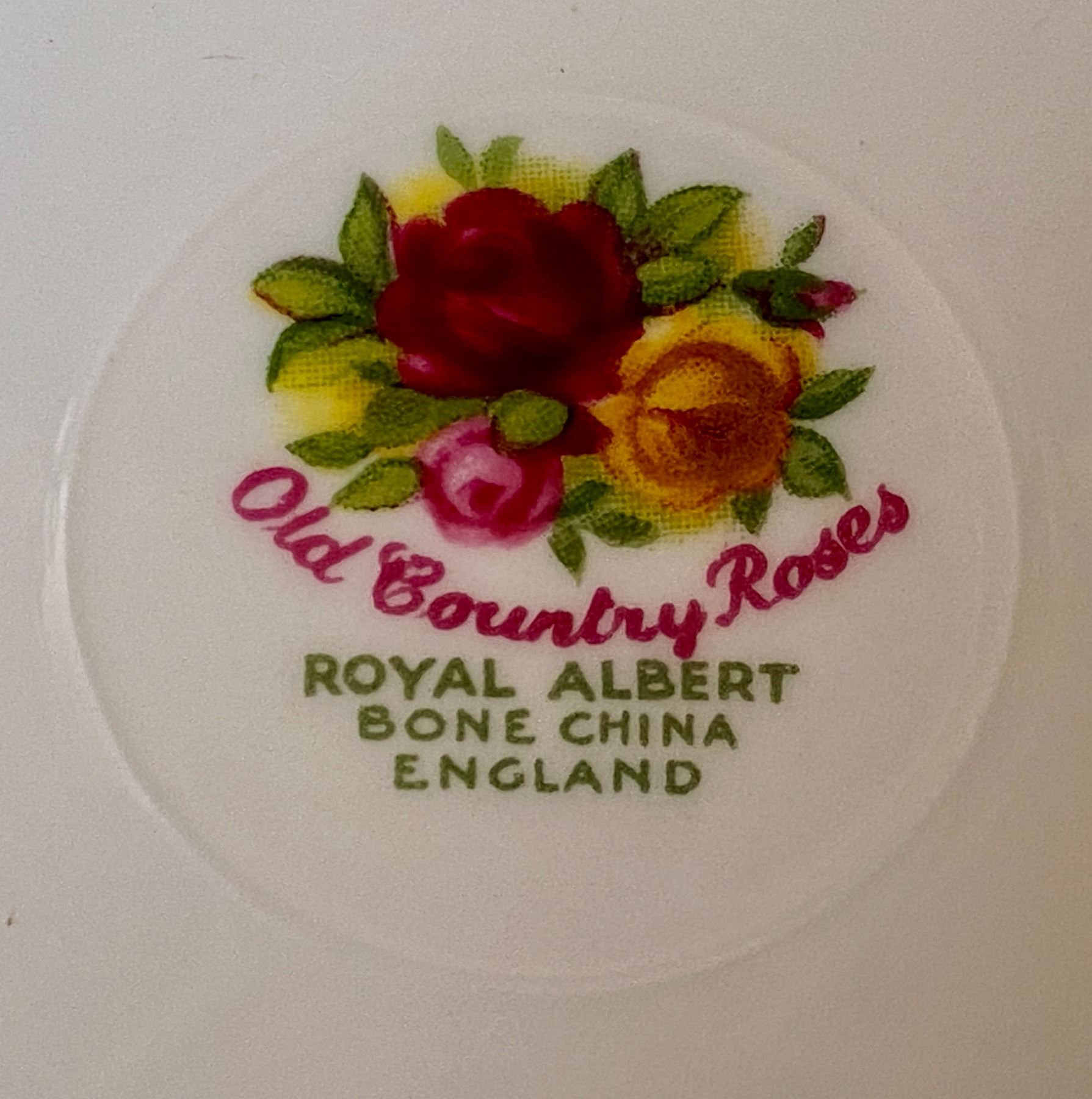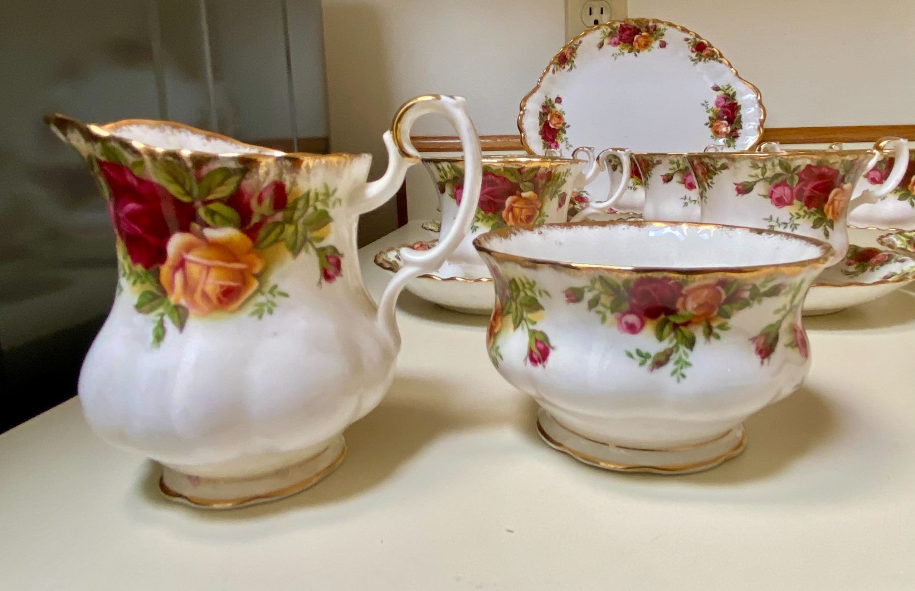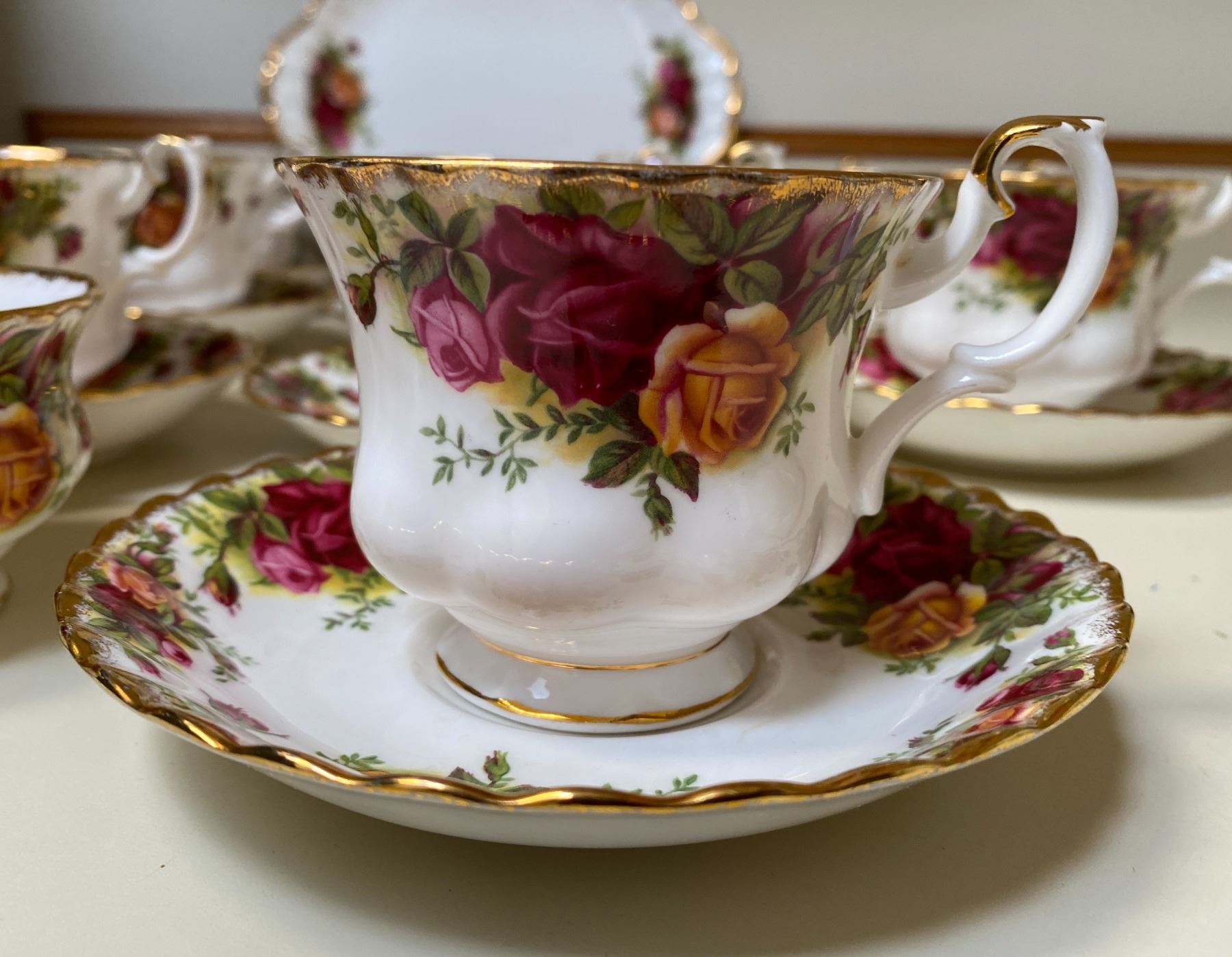 23 pieces of Royal Albert teacups, saucers, serving dish, creamer and sugar bowl.