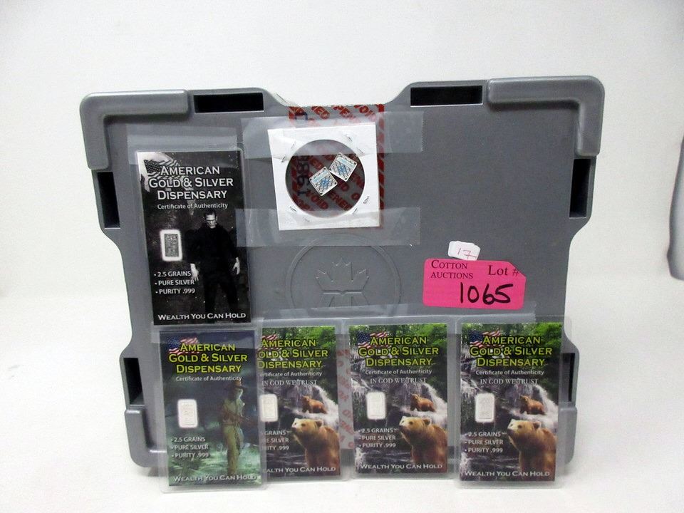 Two 1 gram Geiger Edelmetalle bars and Five 2.5 Silver Grain bars on assay cards. Total of 2 grams and 12.5 Grains. Storage box measures 8" x 10" x 5" tall.