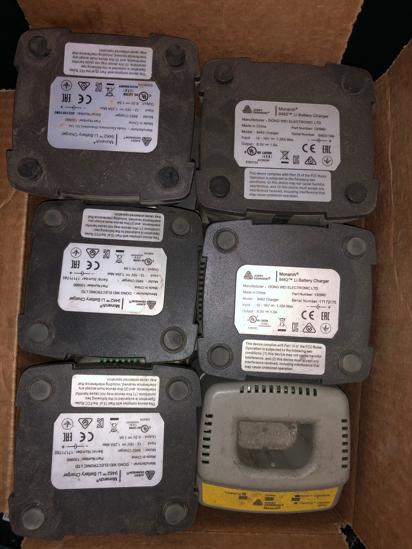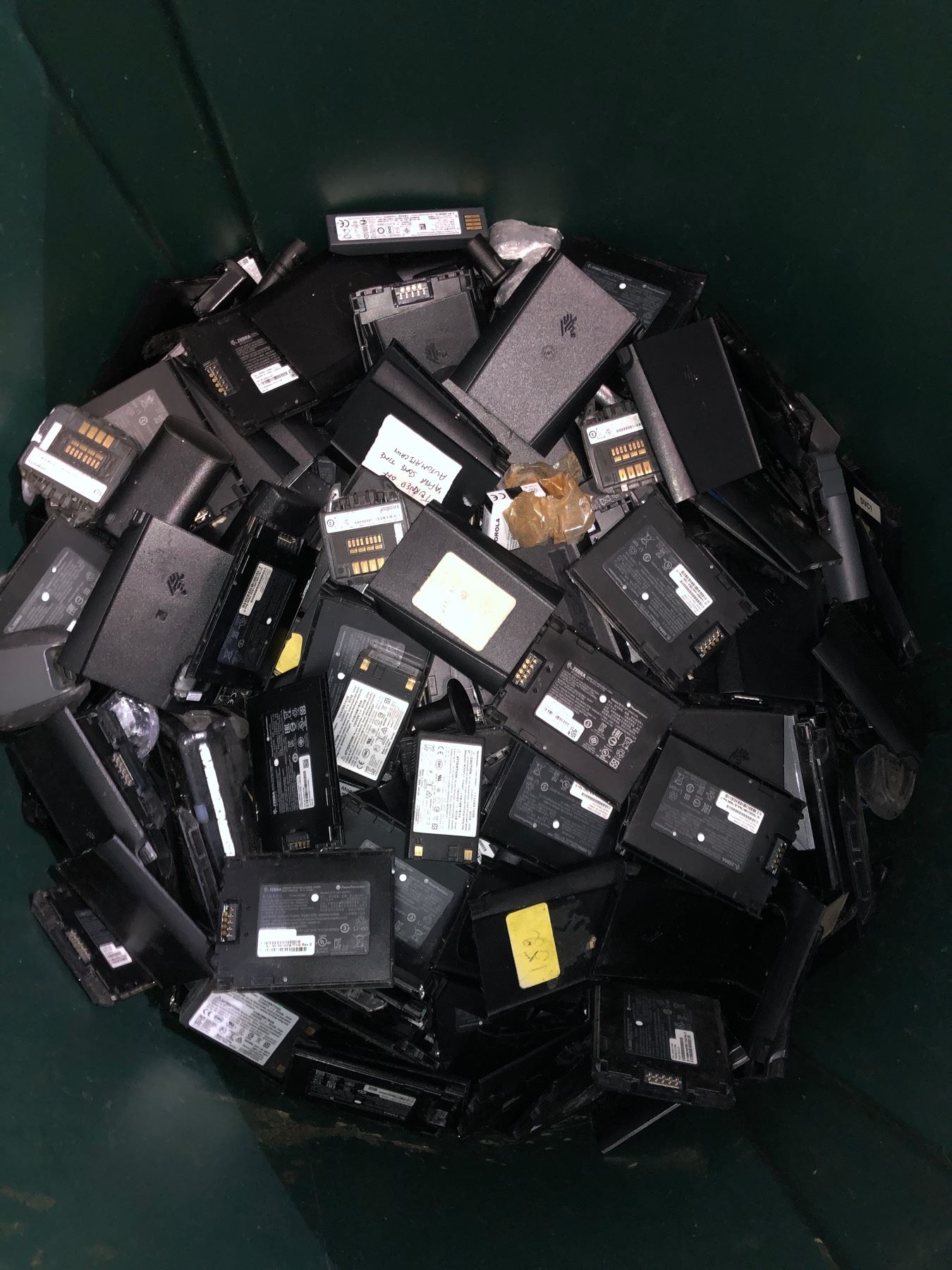 Rubbermaid bin full of battery chargers & batteries - includes avery dinnison (LI battery charger) / zebra batteries & misc. batteries