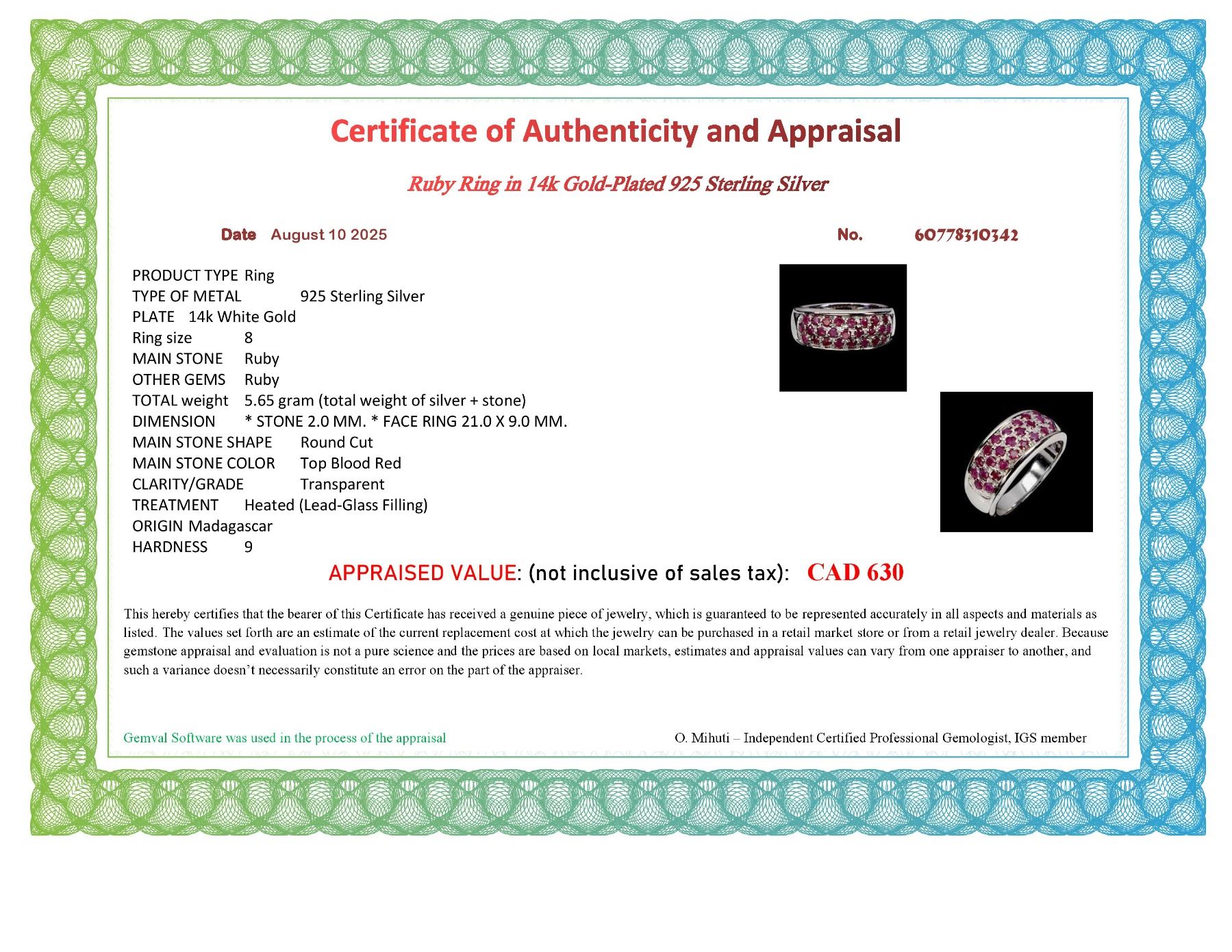 Ruby Ring in 14k White Gold-Plated 925 Sterling Silver – Size 8 Appraised Replacement Value CAD 630