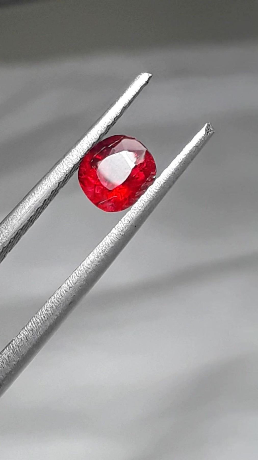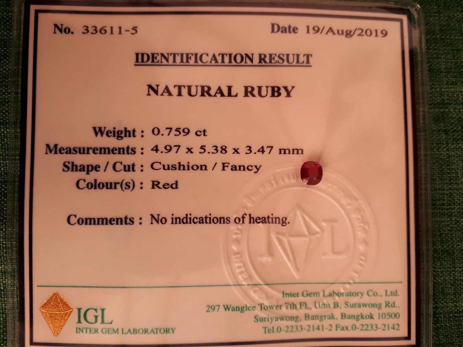 loose faceted precious sapphire, brand new without tags from Madagascar. GEMSTONE TYPE: Genuine Madagascar RubyRECOMMENDED JEWELRY SETTINGS: Solitaire Ring, Women Rings, Sapphire solitaire, BraceletsCERTIFICATE: IGL/GIA Brief included. Any other custom certificate paid by the buyerORIGIN: MadagascarCARAT SIZE: 0.759DIMENSIONS: Length 5.38 x Width 4.97 x Height 3.47 mmSHAPE/CUT: premium handcrafted cushion cut, minor flaw during cutting process; a tiny fraction broke away at the girdle but can't be see upon setting it into jewelryTREATMENTS: None (No Enhancement)COLOR/COLOUR: Vivid RedGIA COLOR CODE: RCLARITY: VSSATURATION: 6=vividTONE: 5=MediumFINISH & POLISH: very good