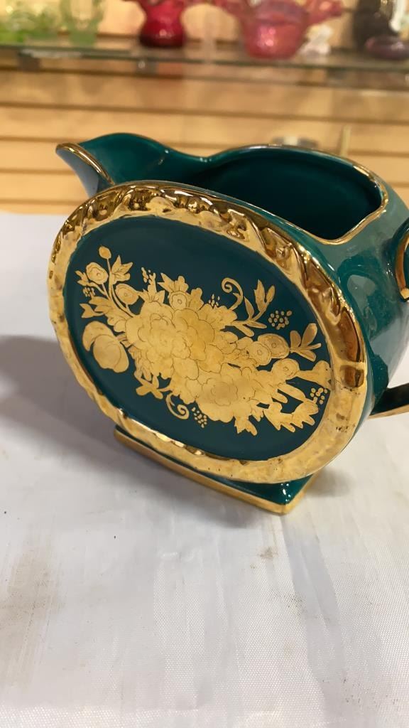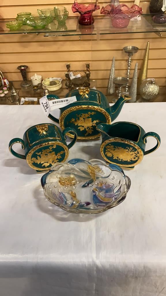 SADLER TEAPOT, CREAM AND SUGAR SET AND ART GLASS DISH