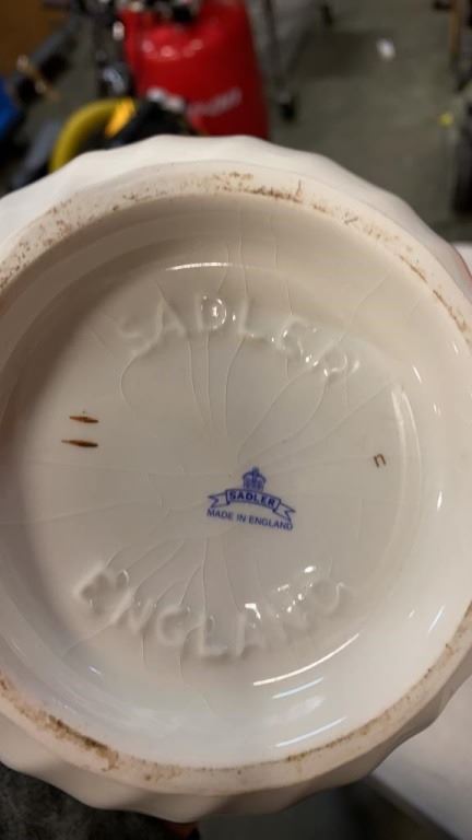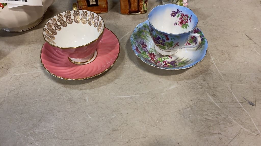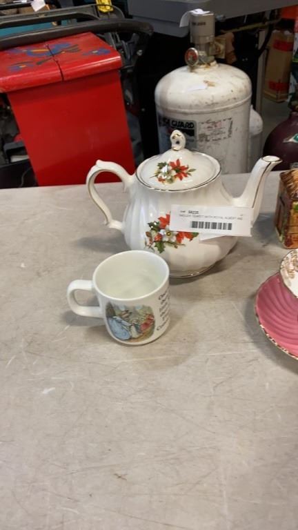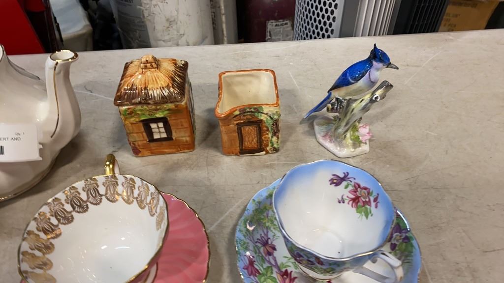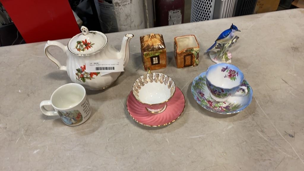 SADLER TEAPOT WITH ROYAL ALBERT AND ANSLEY TEACUPS, COTTAGE WARE AND BLUE JAY