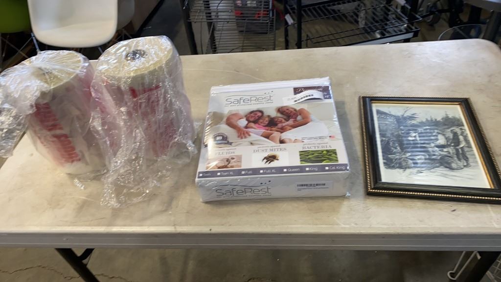 SAFE REST FULL MATTRESS PROTECTER, 2 ROLLS OF BULK FOOD BAGS AND VINTAGE HUDSONS BAY CO PRINT