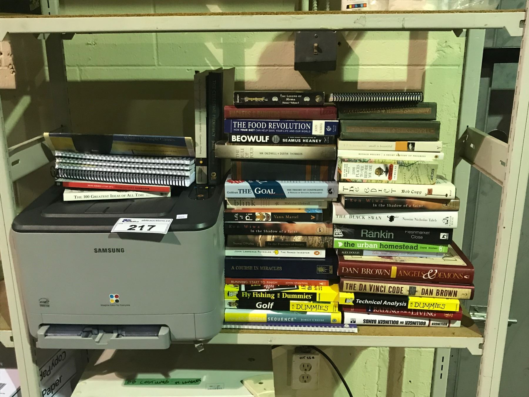 SAMSUNG PRINTER, DIPLOMAT MINI FRIDGE, & ASSORTED BOOKS