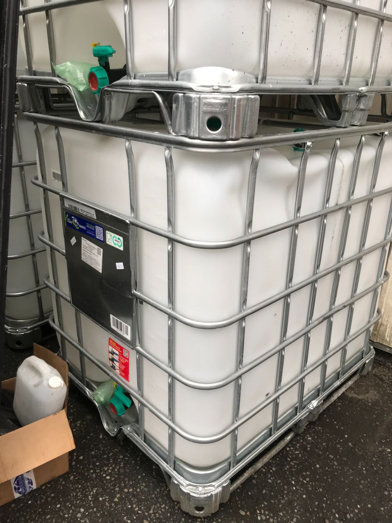 SCHUTZ FOOD GRADE 1000L PLASTIC COMMERCIAL METAL FRAMED LIQUID TRANSPORT PALLET ( WAS USED TO TRANSPORT SUNFLOWER OIL )