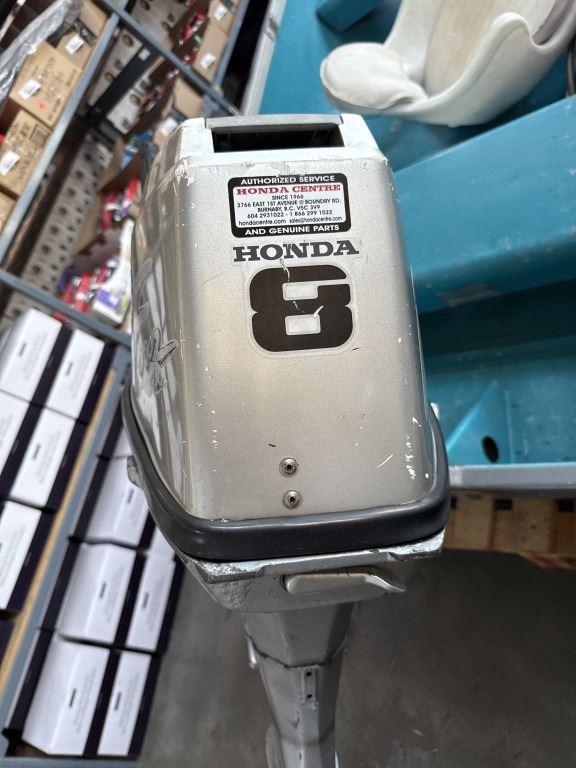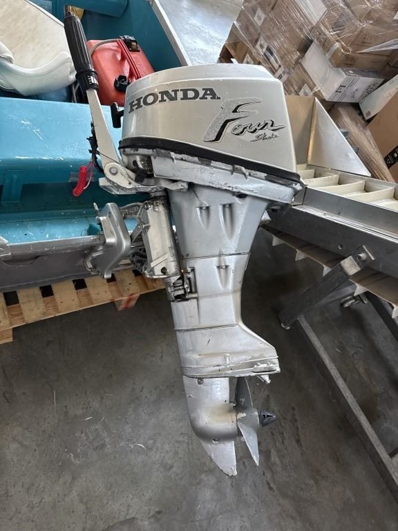 SEARS ALUMINUM 12FT FISHING BOAT WITH HONDA 8HP FOUR STROKIE GAS MOTOR, RUNNING, INCLUDED OARS, 2 SE