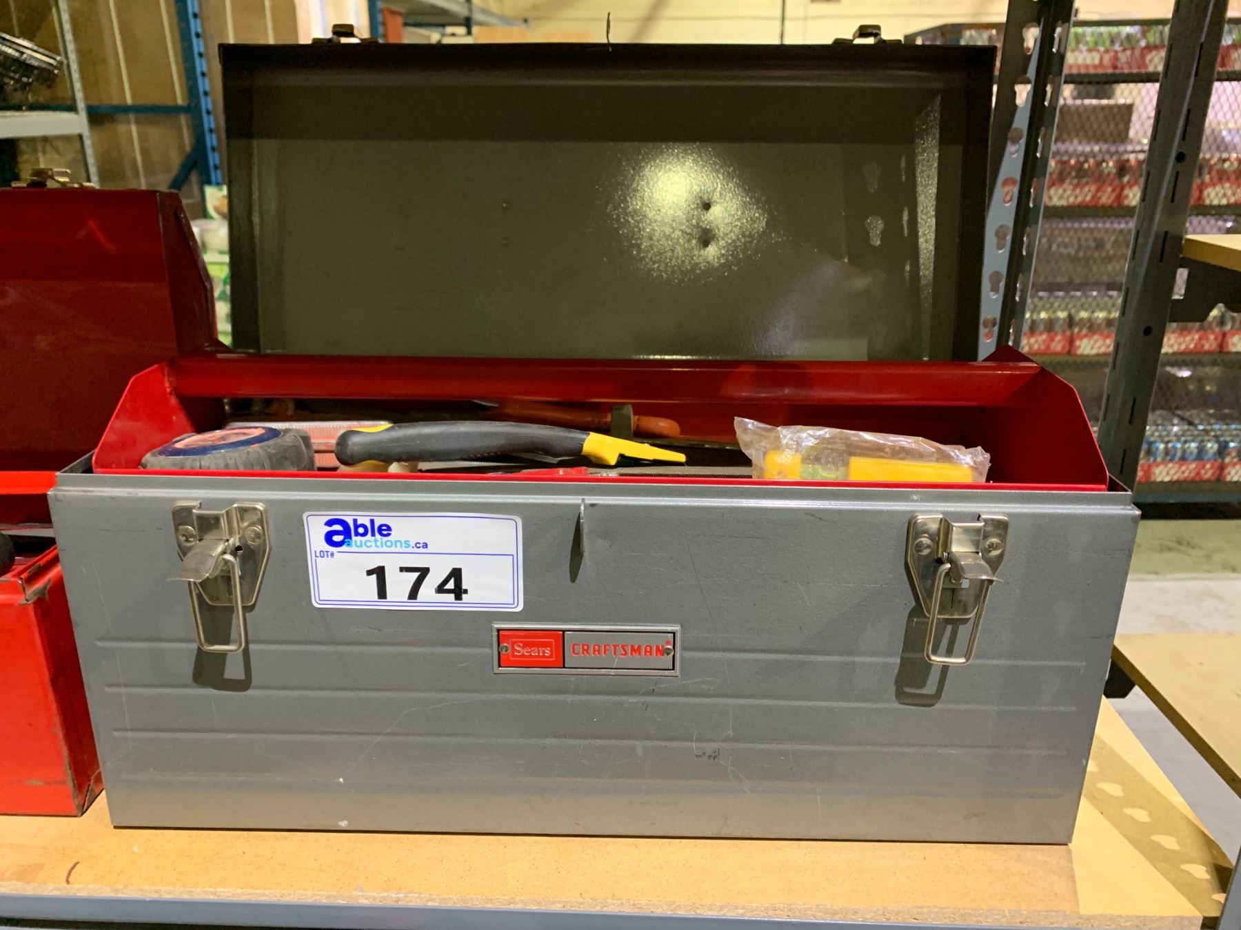 SEARS CRAFTSMAN METAL 20" TOOLBOX WITH ASSORTED CONTENTS INCLUDING; MINI LEVEL, CHALK LINE, MINI C-CLAMP & MORE