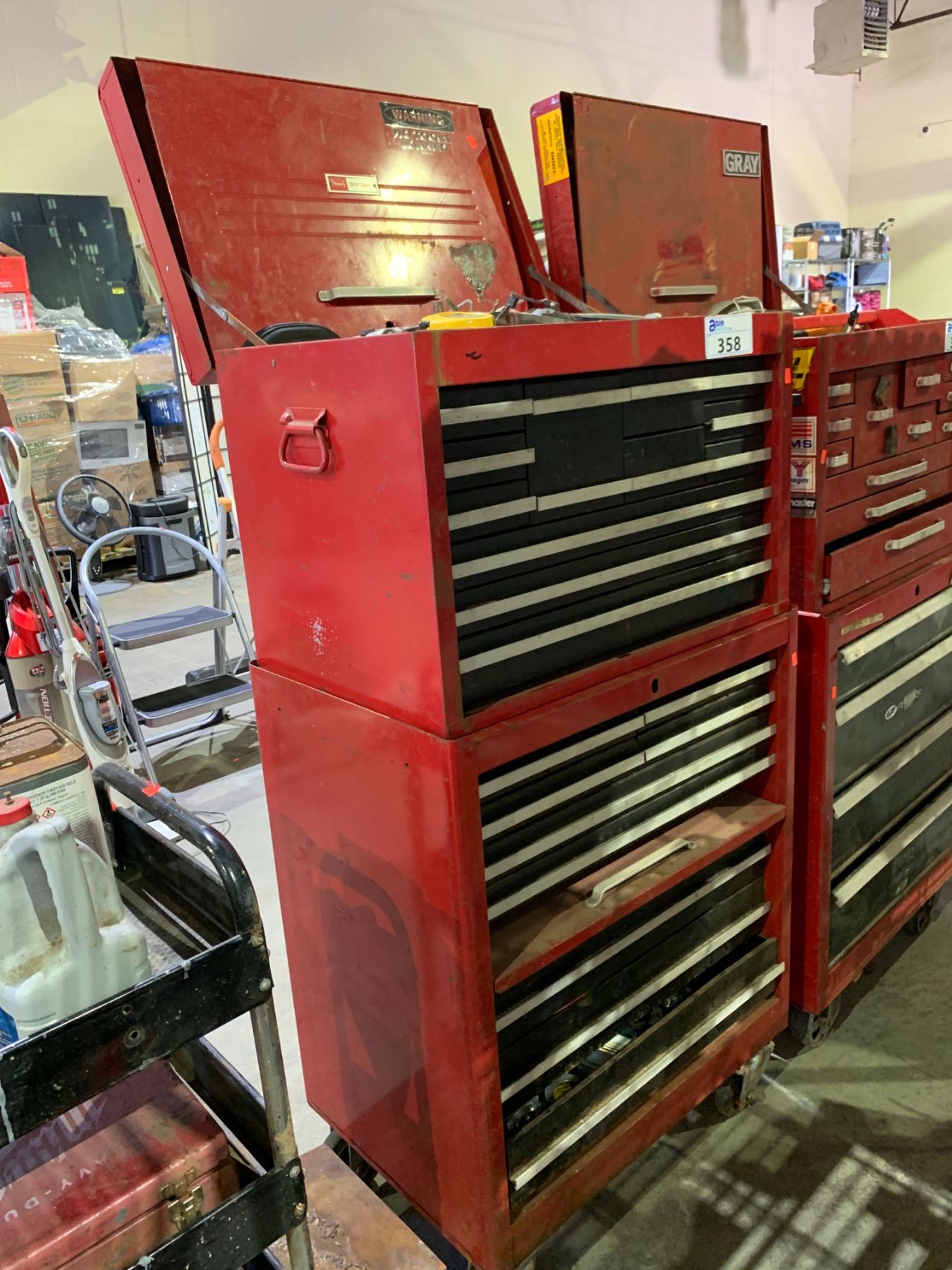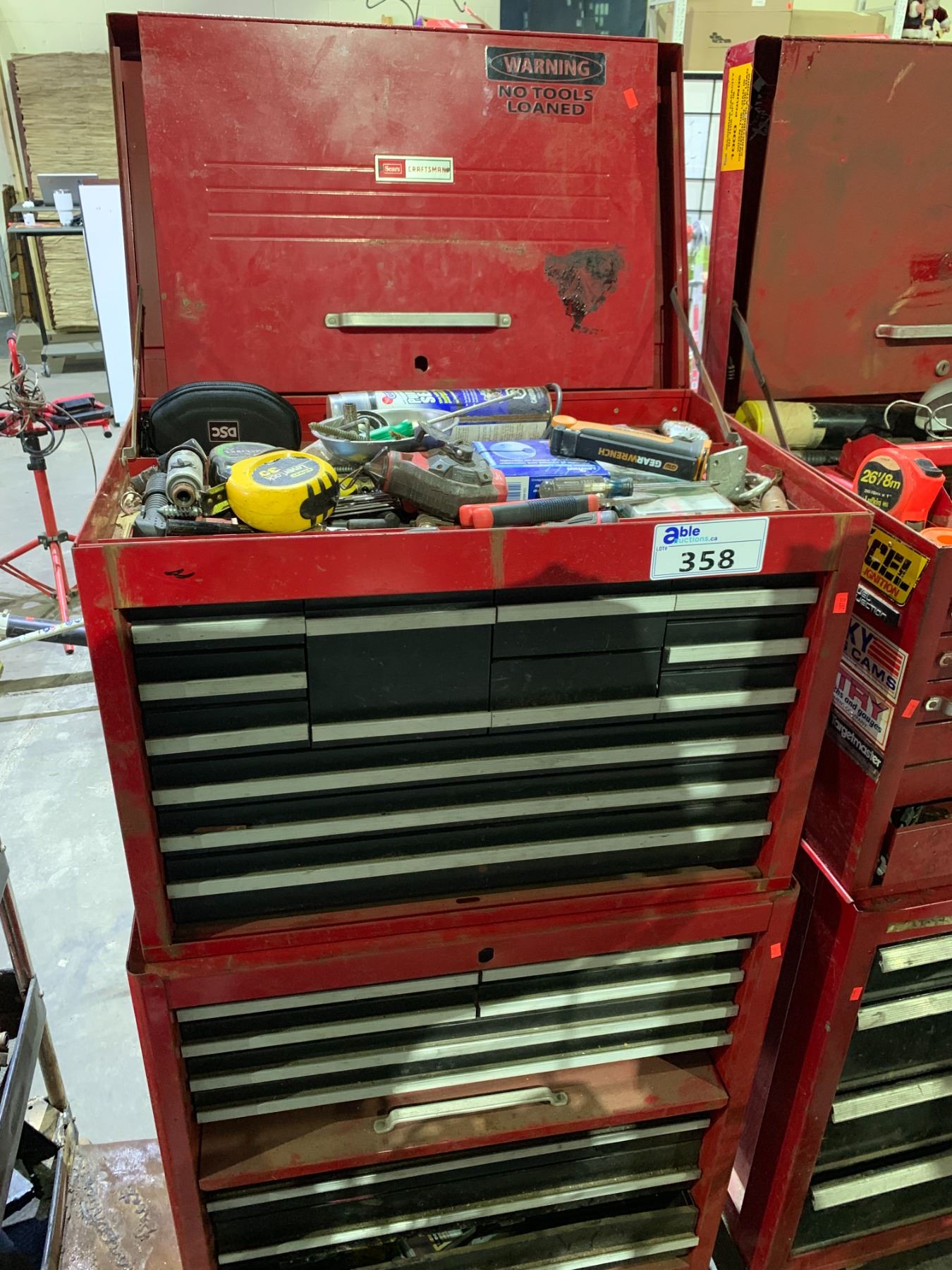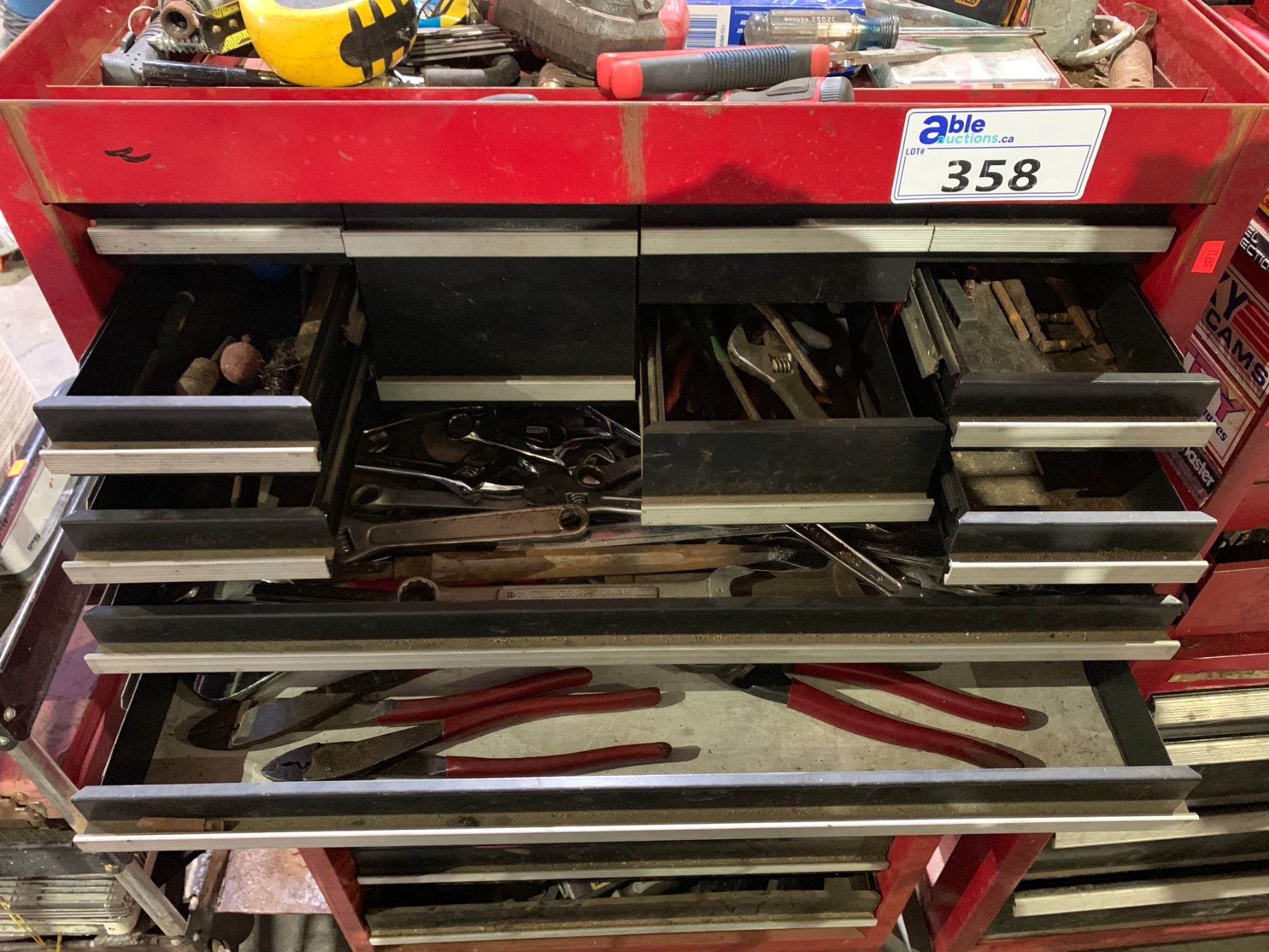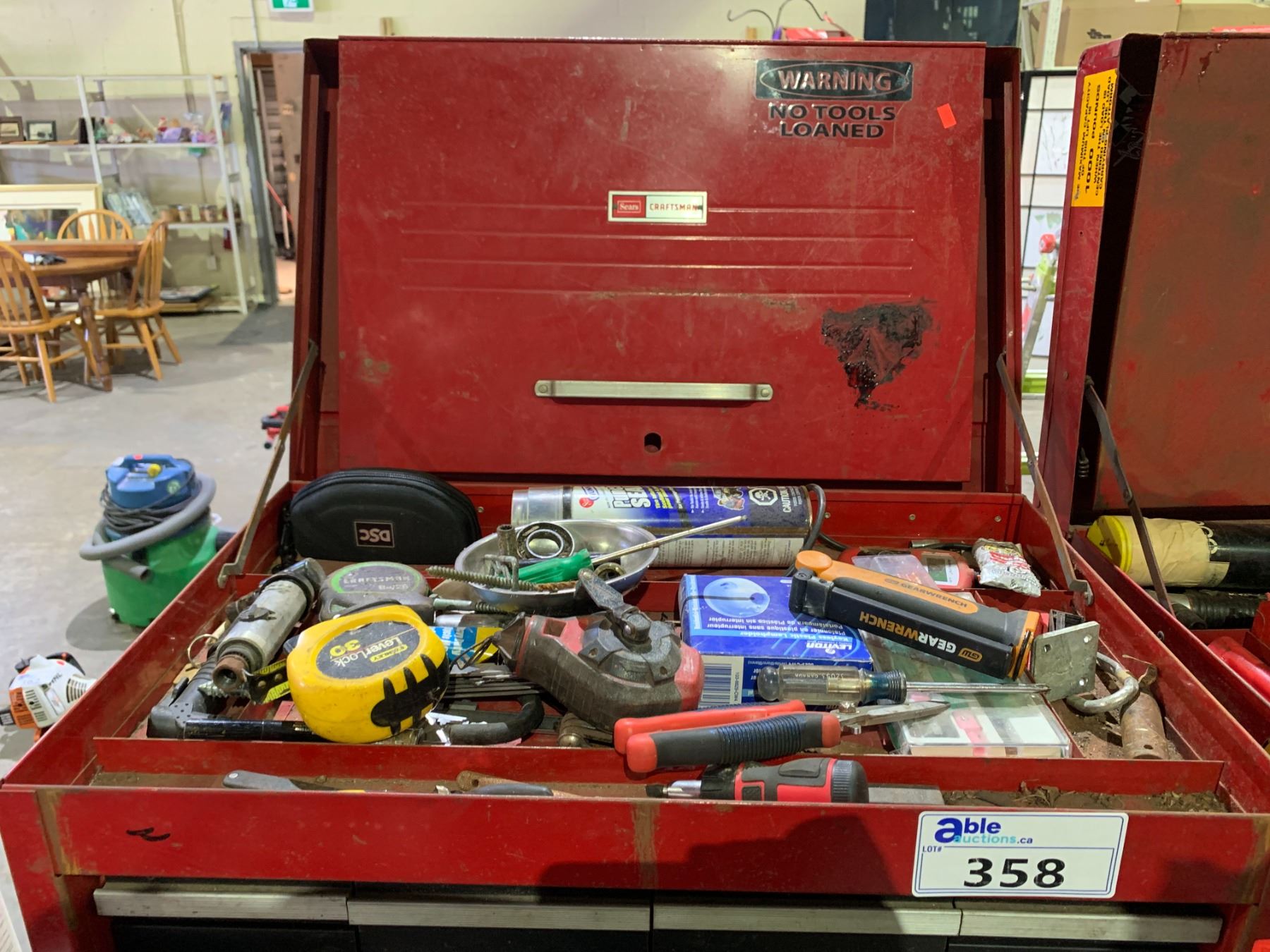 SEARS CRAFTSMAN MOBILE TOOLBOX WITH ASSORTED CONTENTS INCLUDING; DRILL BITS, WRENCHES, JIG SAW & MORE
