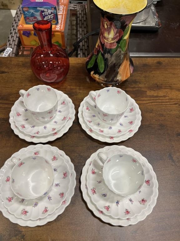 SET OF 4 SPADE CUPS AND SAUCERS WITH MATCHING BREAD AND BUTTER PLATES VINTAGE CRANBERRY GLASS VASE AND TUNSTALL VASE