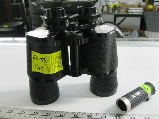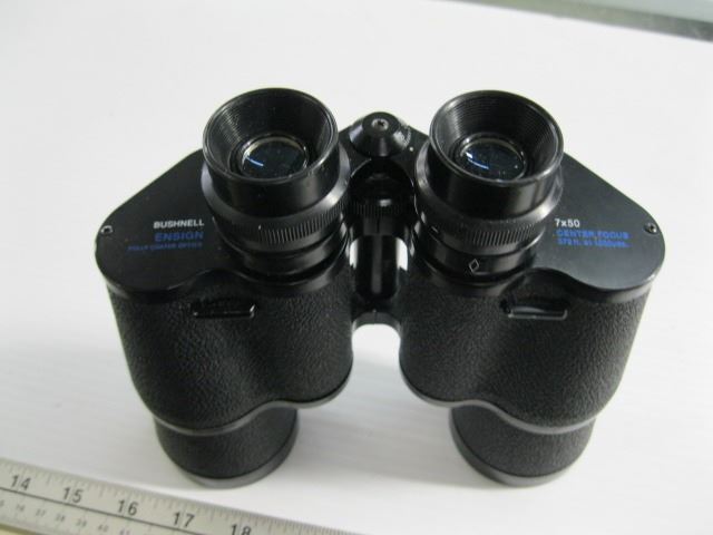 SET OF BUSHNELL ENSIGN 7.50 BINOCULARS & A MINI BUSHNELL GOLFING RANGE FINDER SCOPE