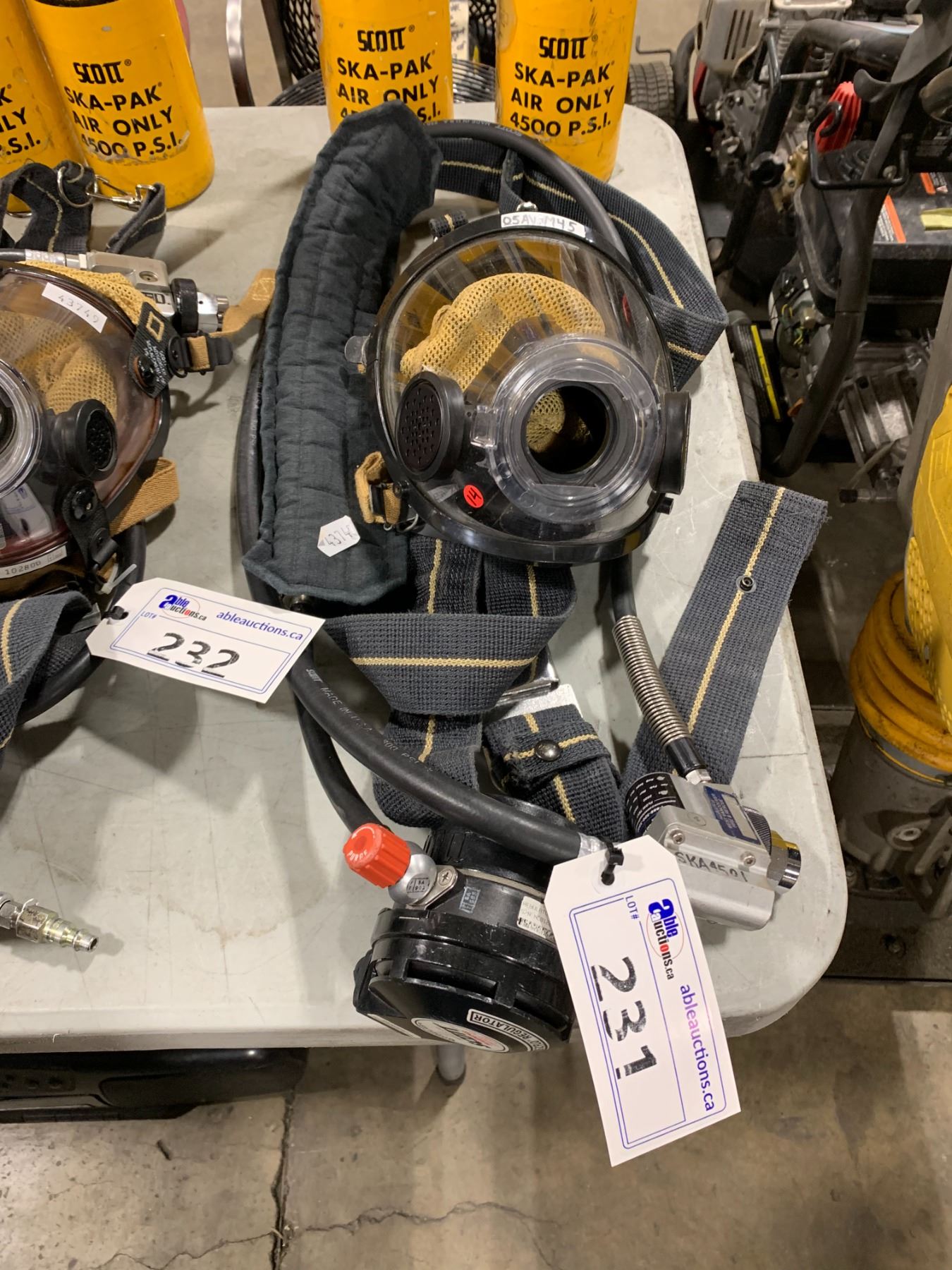 SET OF FIRE RESCUE EQUIPMENT INCLUDING: PAIR OF SCOTT SKA-PACK TC-3HWM-310 BREATHING AIR CYLINDER WITH AIR-LINE RESPIRATOR, PRESSURE REGULATOR & HEAD HARNESS/ FACE SHIELD