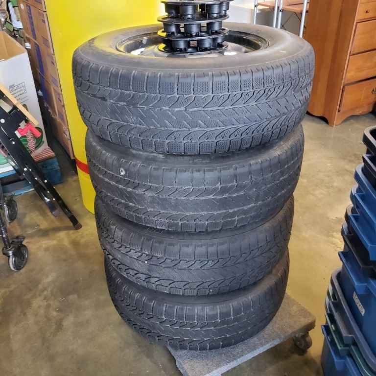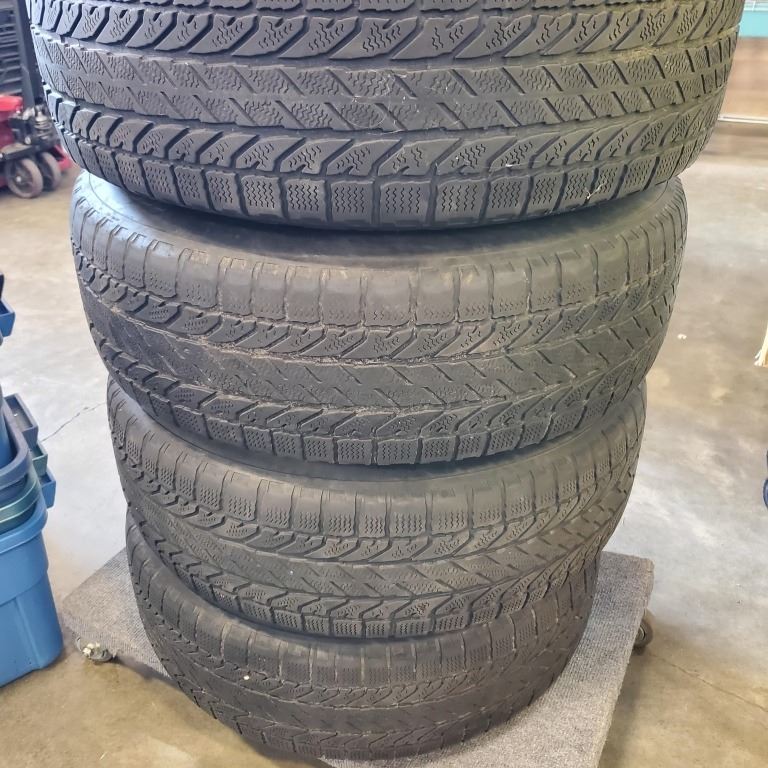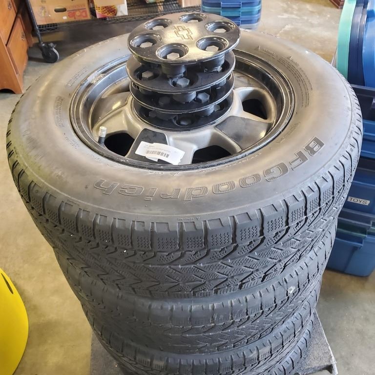 SET OF FOUR BF GOODRICH WINTER SLALOM 225/70R16 WITH ALUMINUM RIMS AND CHEVROLET CENTER CAPS