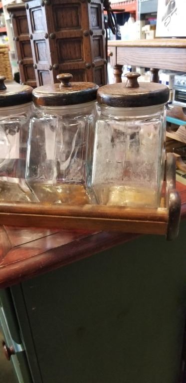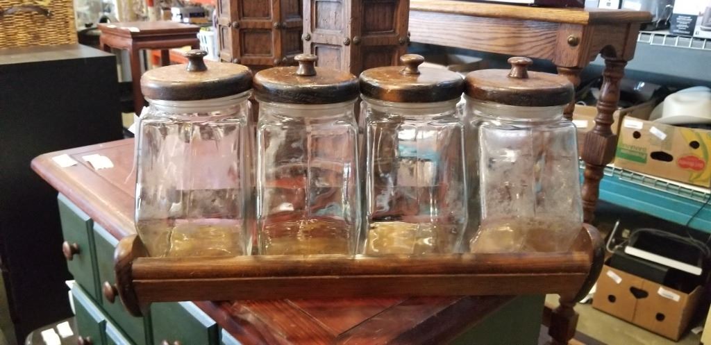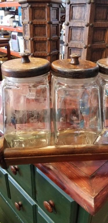 SET OF FOUR GLASS CANISTER SET WITH RACK