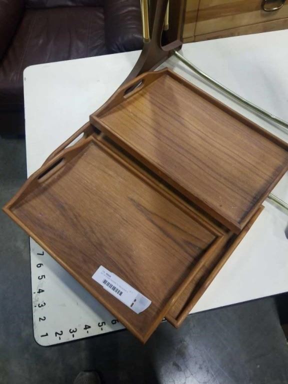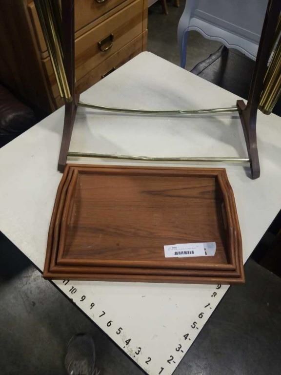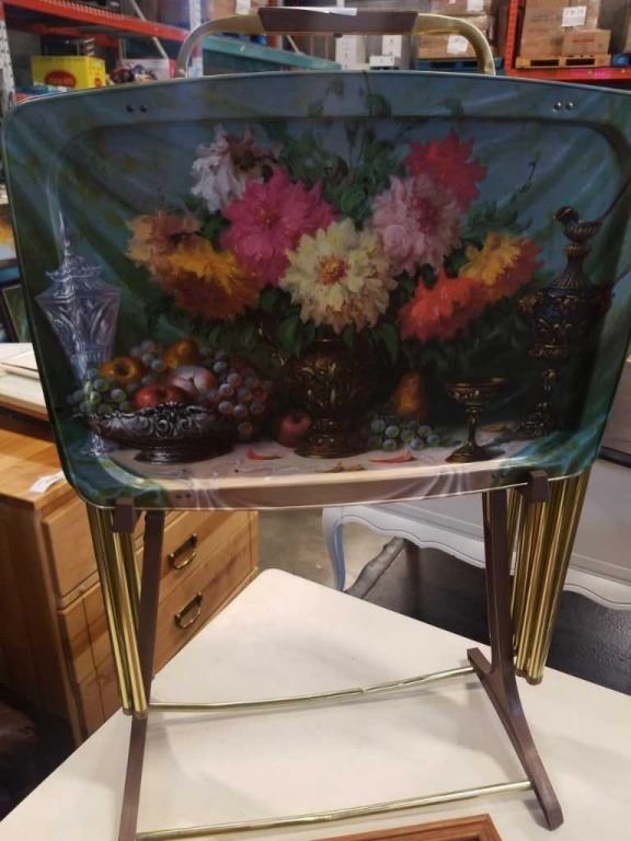SET OF FOUR VINTAGE TV TRAYS AND 3 SERVING TRAYS