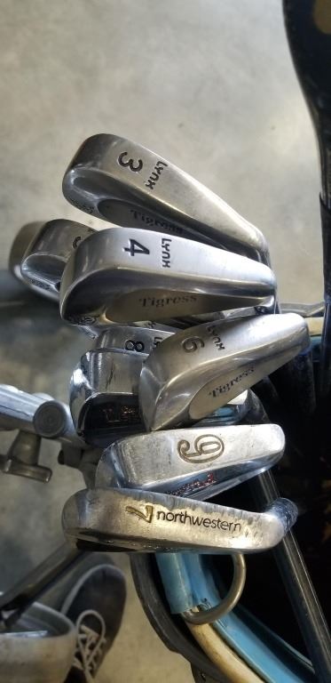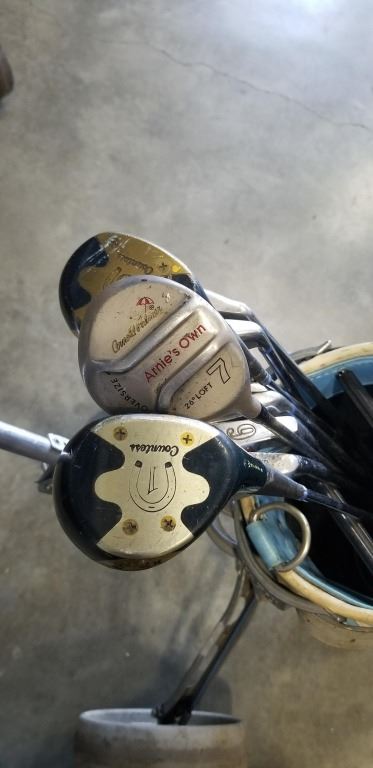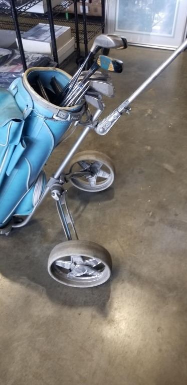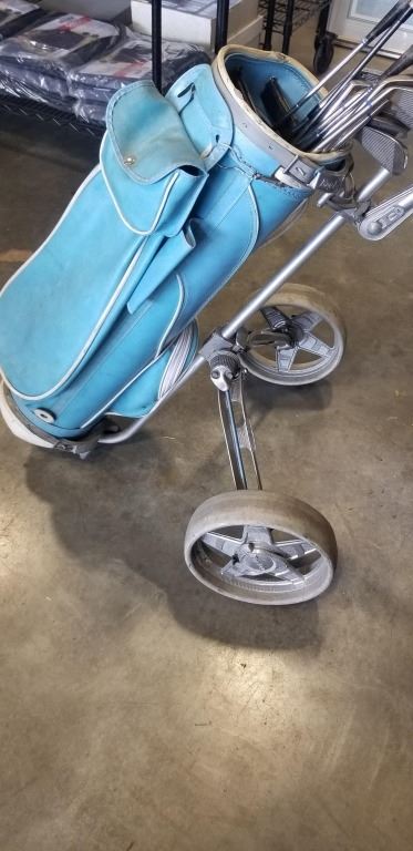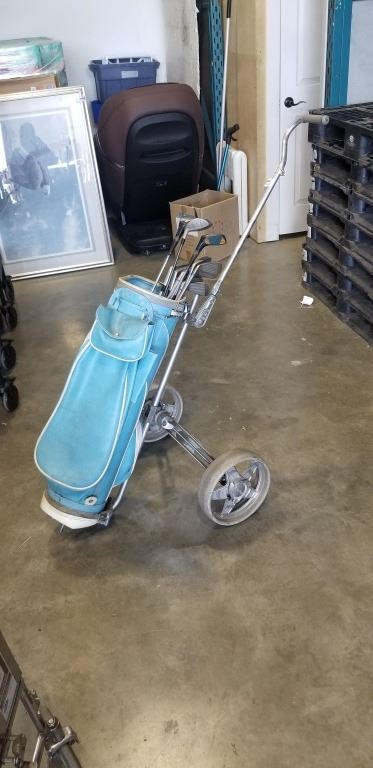 SET OF GOLD CLUBS AND VINTAGE CADDY