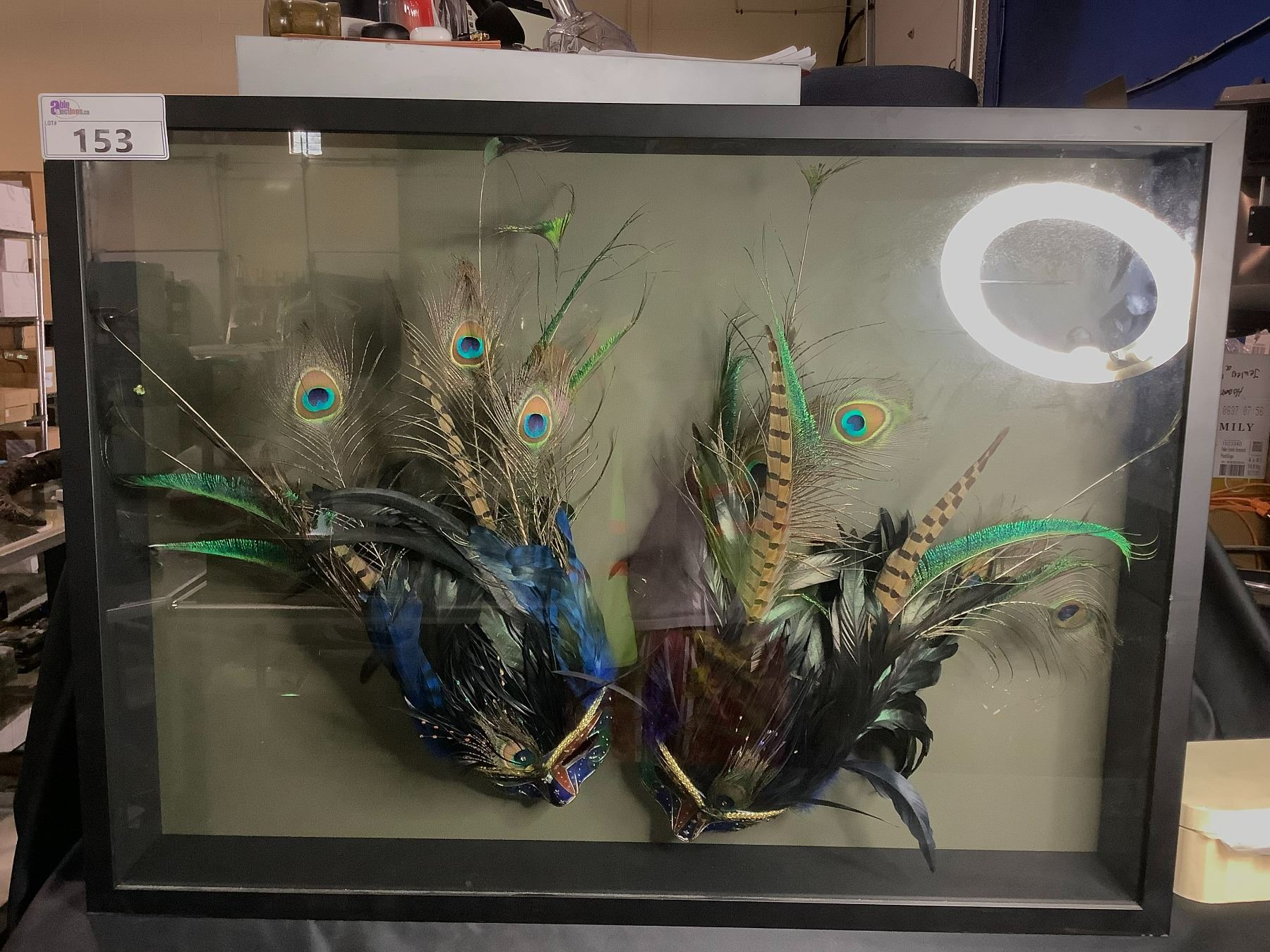 SHADOWBOX WITH 2 MARDI GRAS MASK VENETIAN MASQUERADE FEATHER MASKS