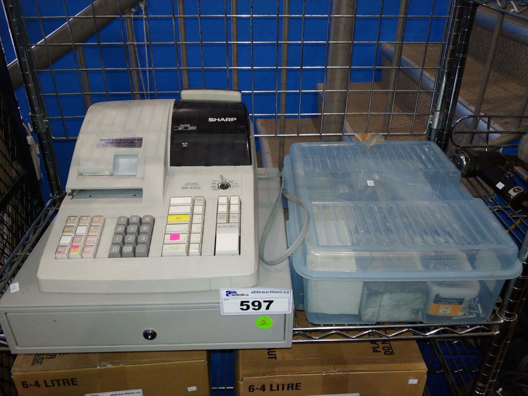SHARP CASH REGISTER AND BIN OF HARDWARE
