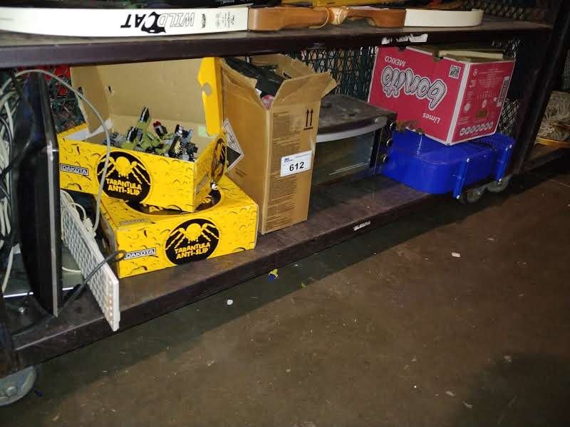 SHELF INCLUDING MONITOR, CDS, BOOKS, LEGOS, FAN AND MORE