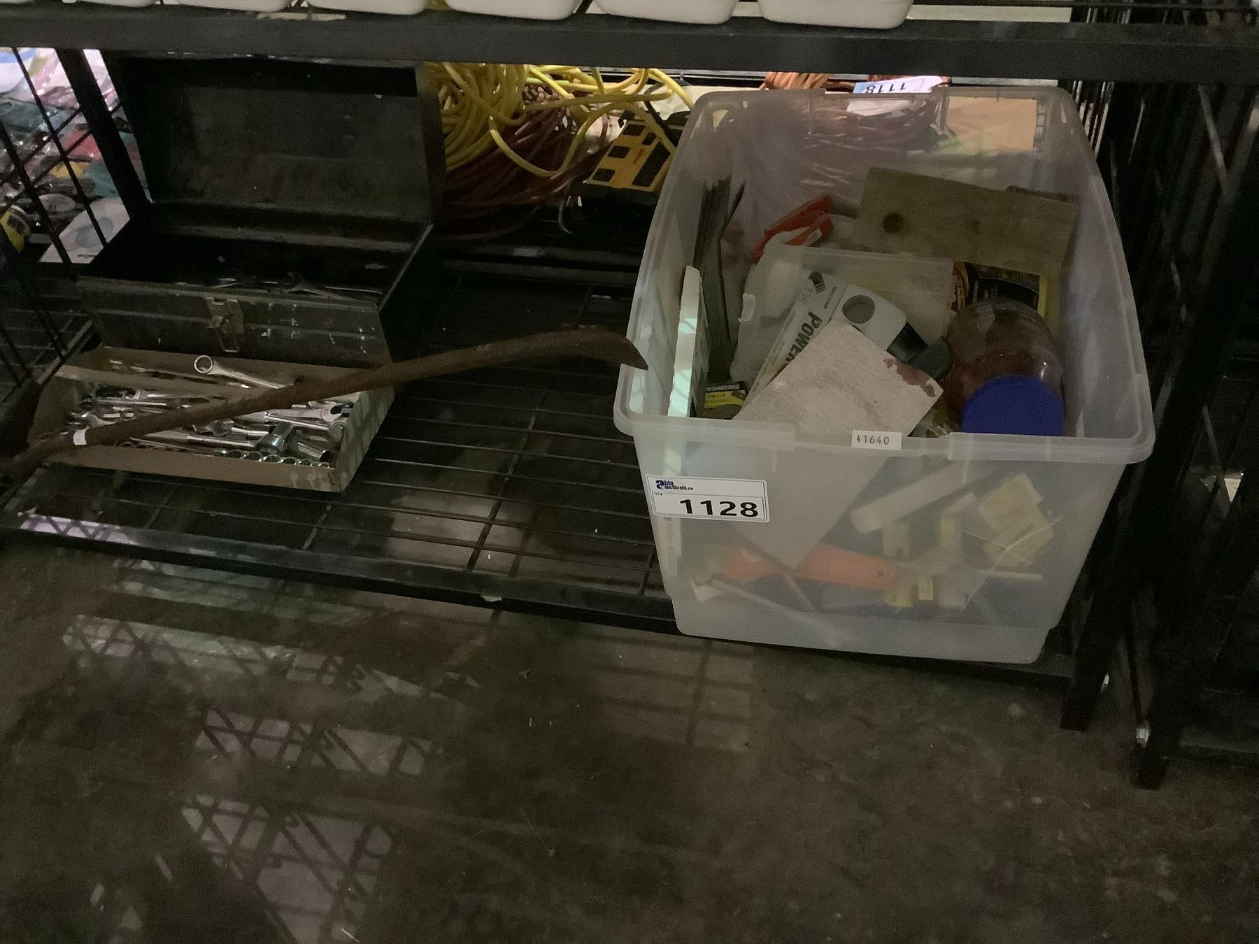 SHELF LOT INCLUDES ASSORTED WRENCHES, SOCKETS, TOOLBOX, AND HARDWARE