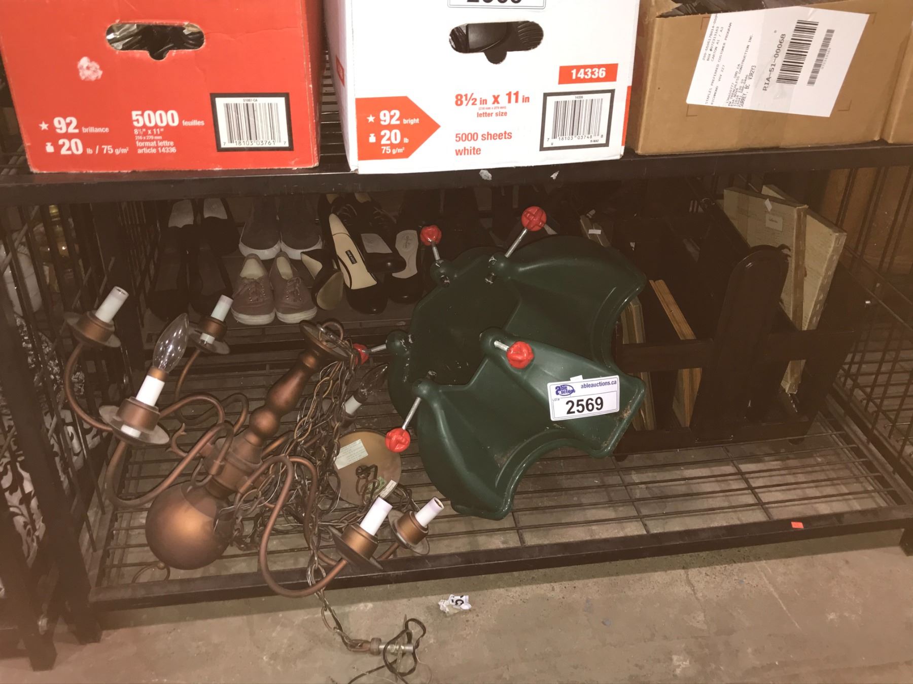 SHELF LOT INCLUDES CHRISTMAS TREE STAND, CHANDELIER, MAGAZINE RACK