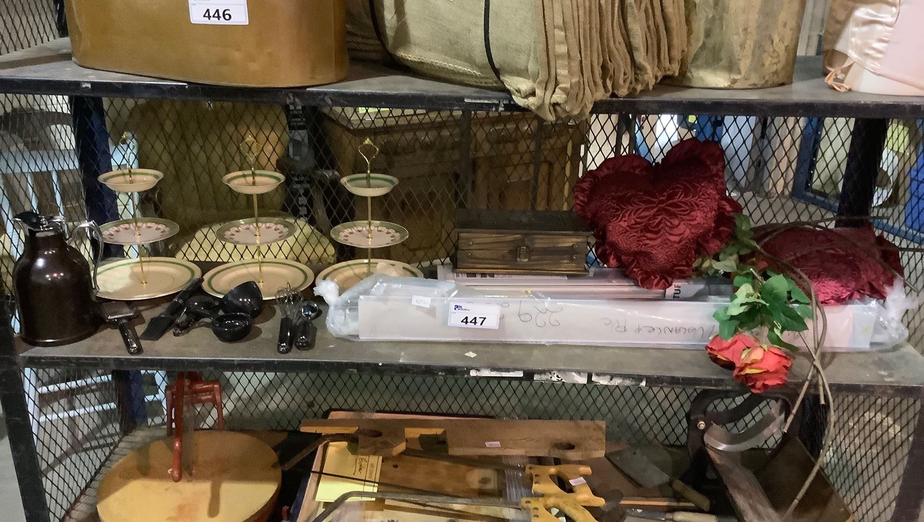 SHELF LOT OF 3 TIER PASTRY SERVERS, KITCHENAID KITCHEN ITEMS, BLINDS, AND MORE