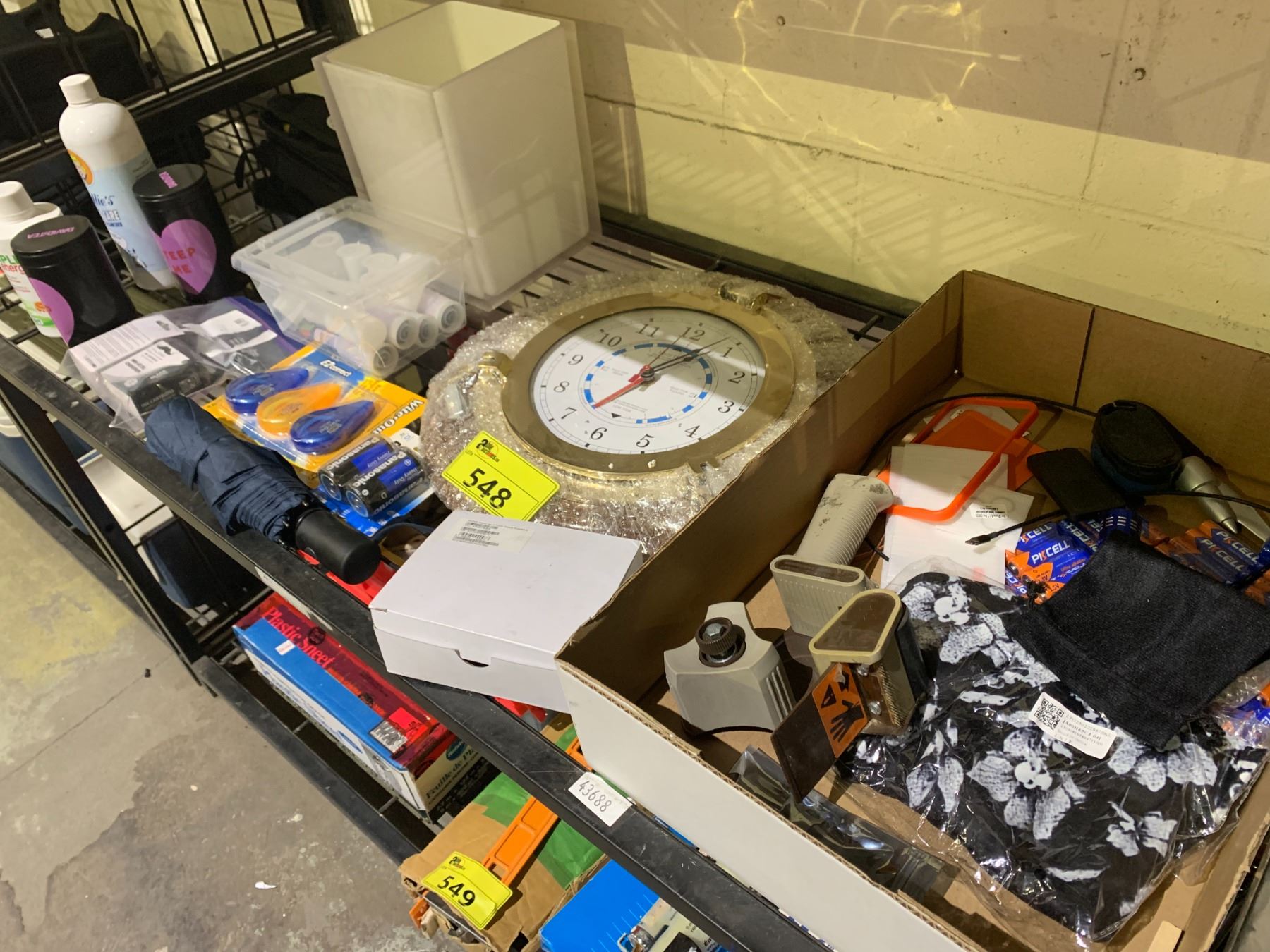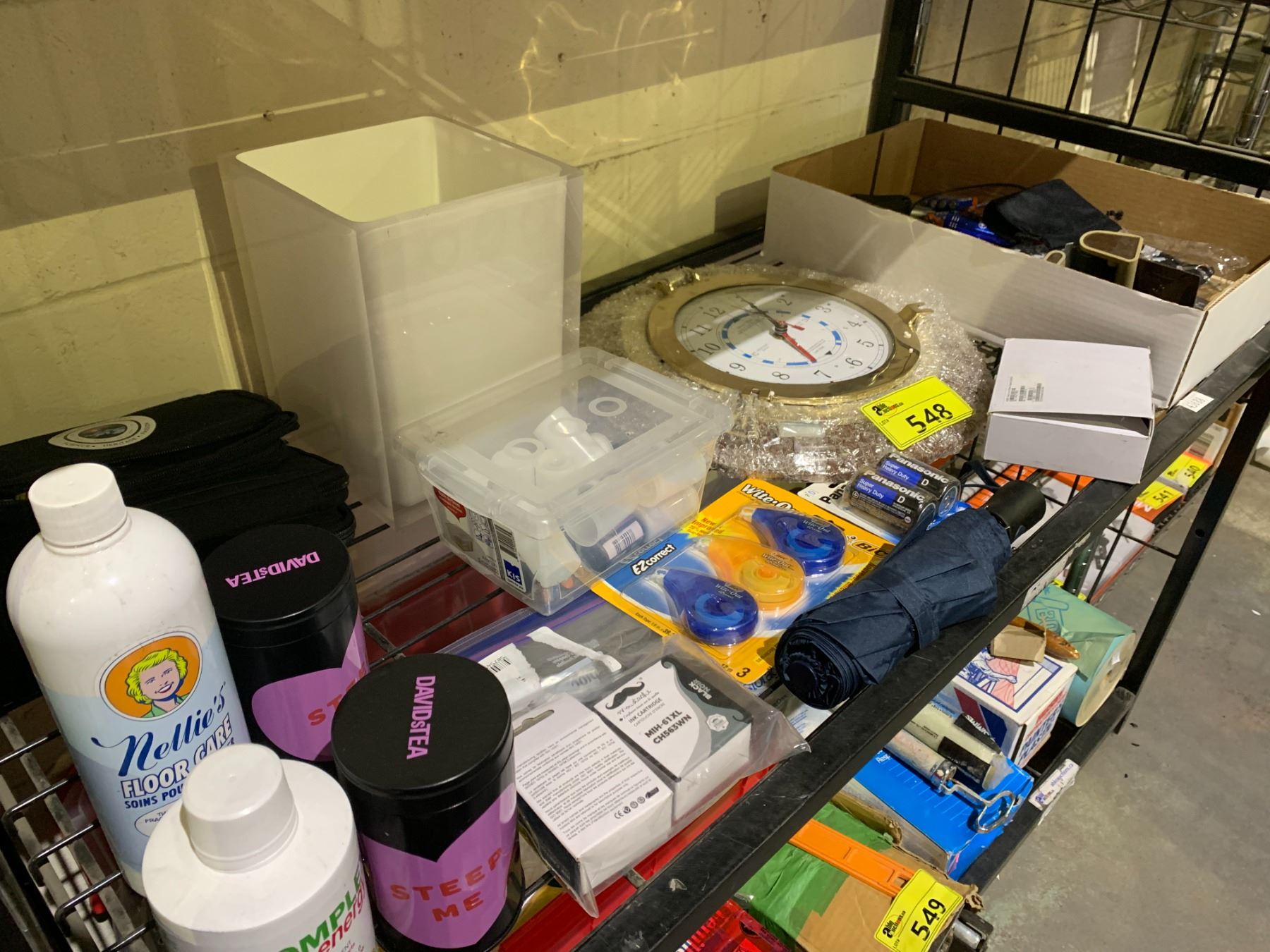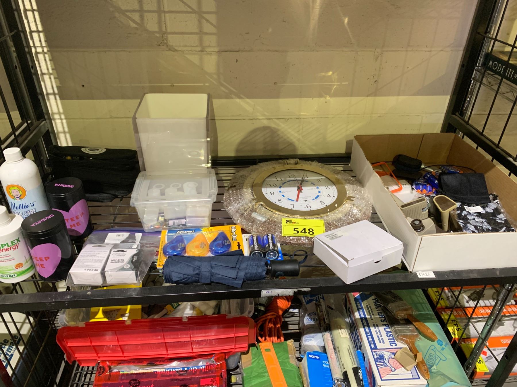 SHELF LOT OF ASSORTED BATTERIES, CLOCK, INK, BODY CARE, AND MORE