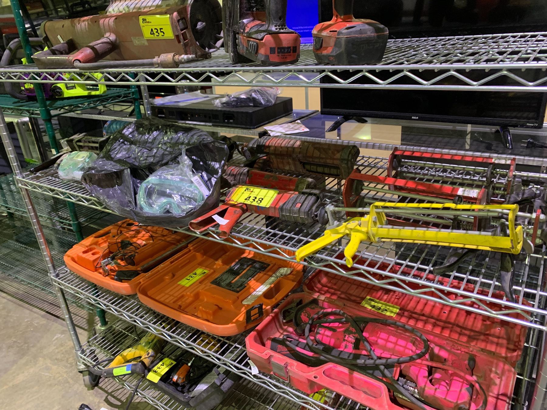 SHELF LOT OF ASSORTED GLUE GUN, GOGGLES AND CAULKING GUN