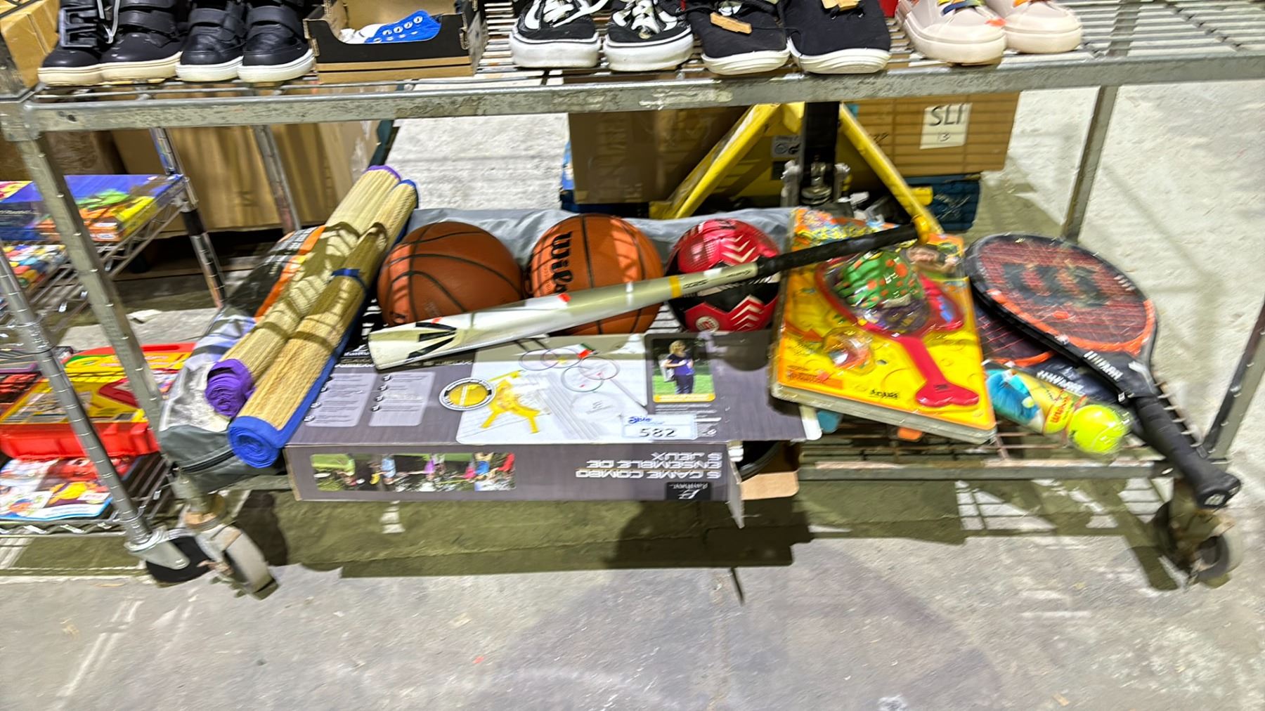 SHELF LOT OF ASSORTED ITEMS INCLUDING; BASKETBALL, SOCCER BALL, TENNIS RACKETS AND MORE