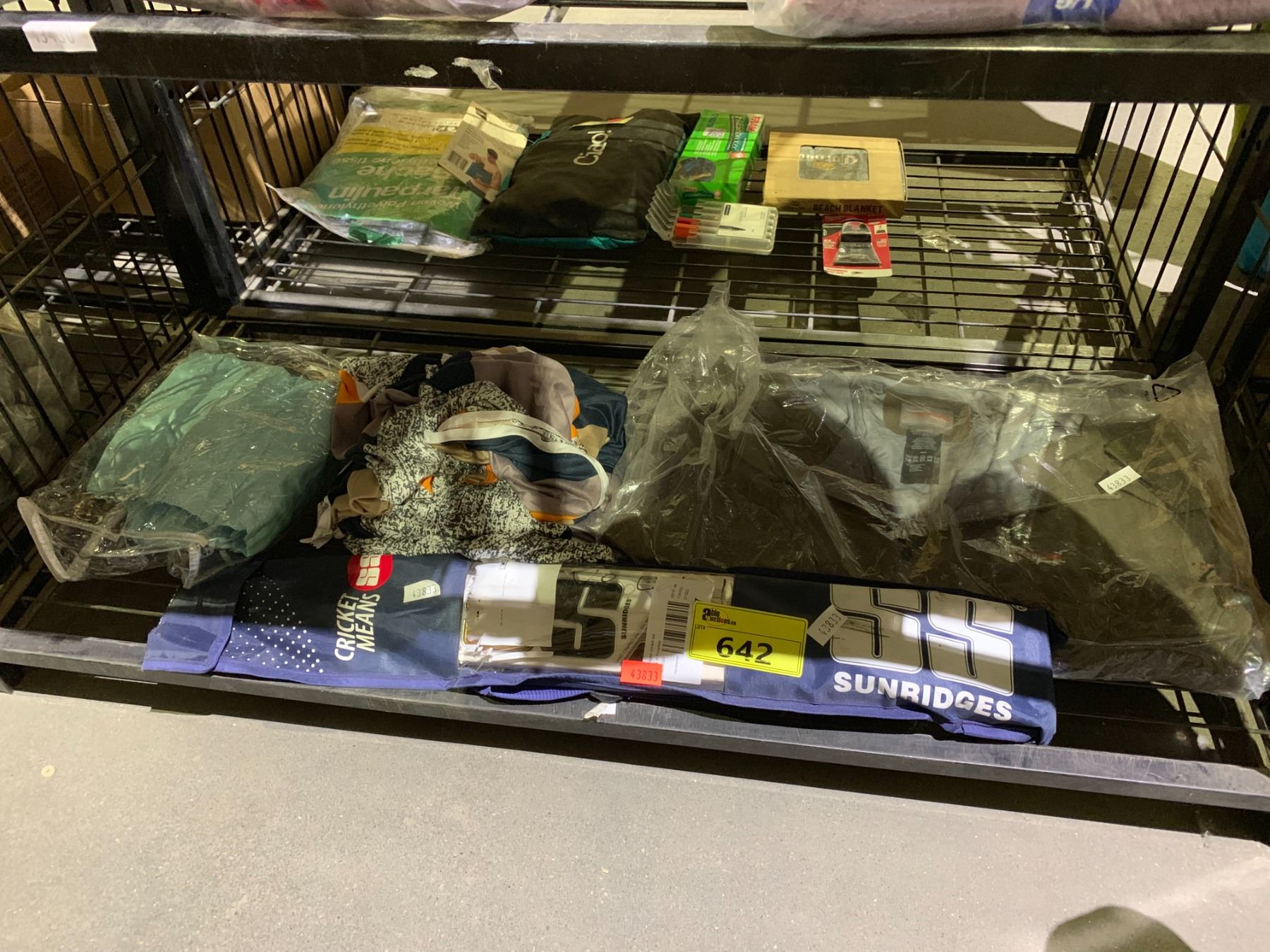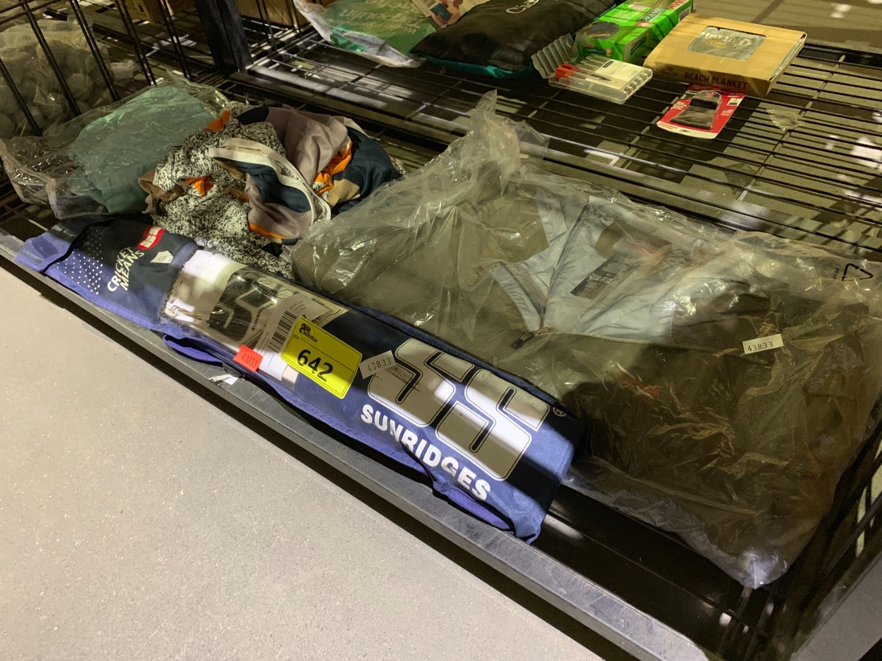 SHELF LOT OF ASSORTED ITEMS INCLUDING; COUCH COVER, CRICKET BAT, AND MORE