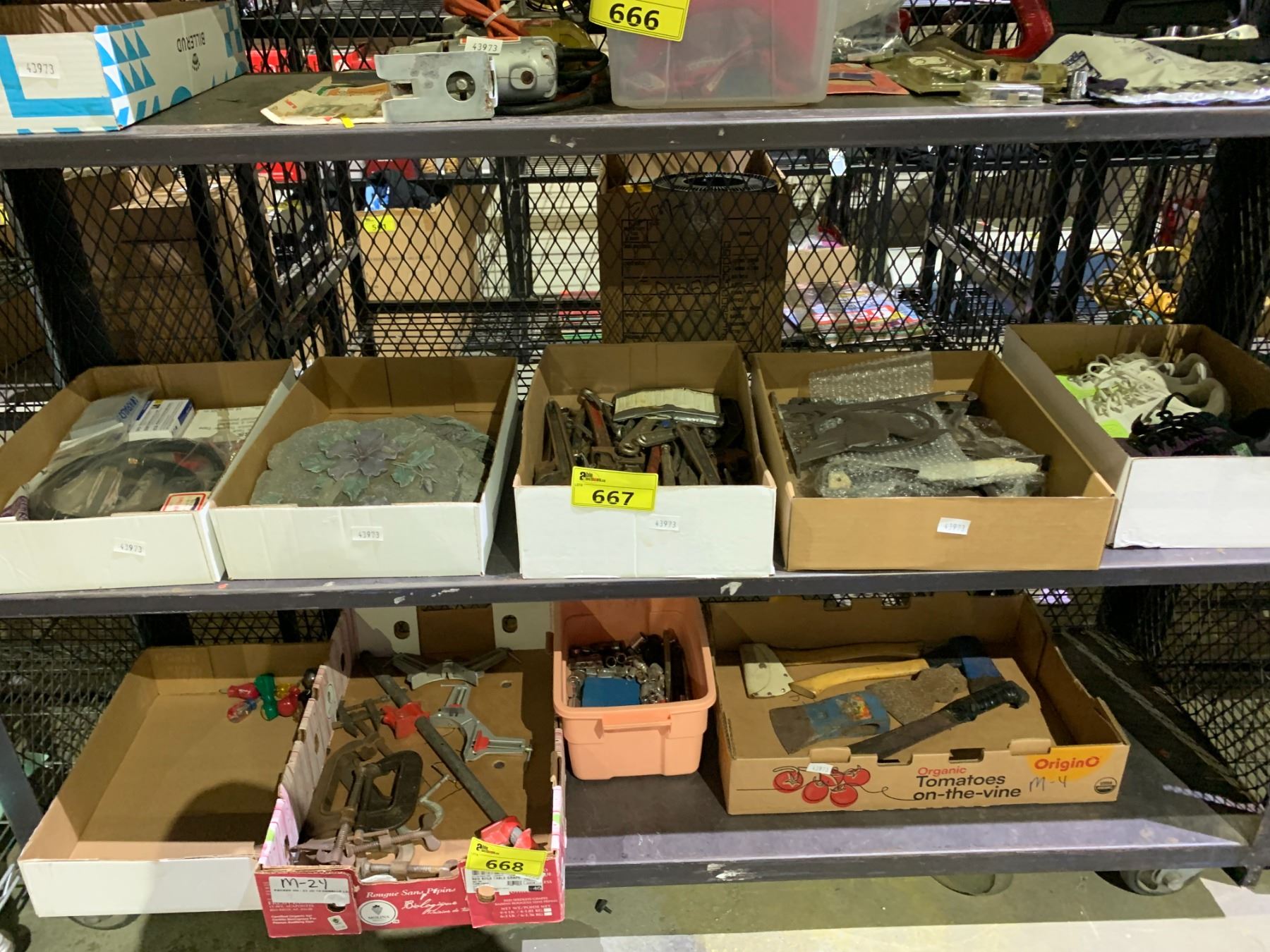 SHELF LOT OF ASSORTED ITEMS INCLUDING; OUT DOOR GARDEN STONES, NIKES RUNNERS SIZE8.5, TOOLS AND MORE