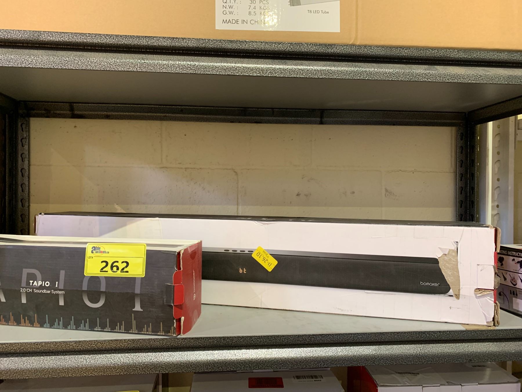 SHELF LOT OF ASSORTED ITEMS, INCLUDING, TAPIO SPEAKER, BOMAKER SPEAKER, AND AC ELECTRIC AIR PUMP