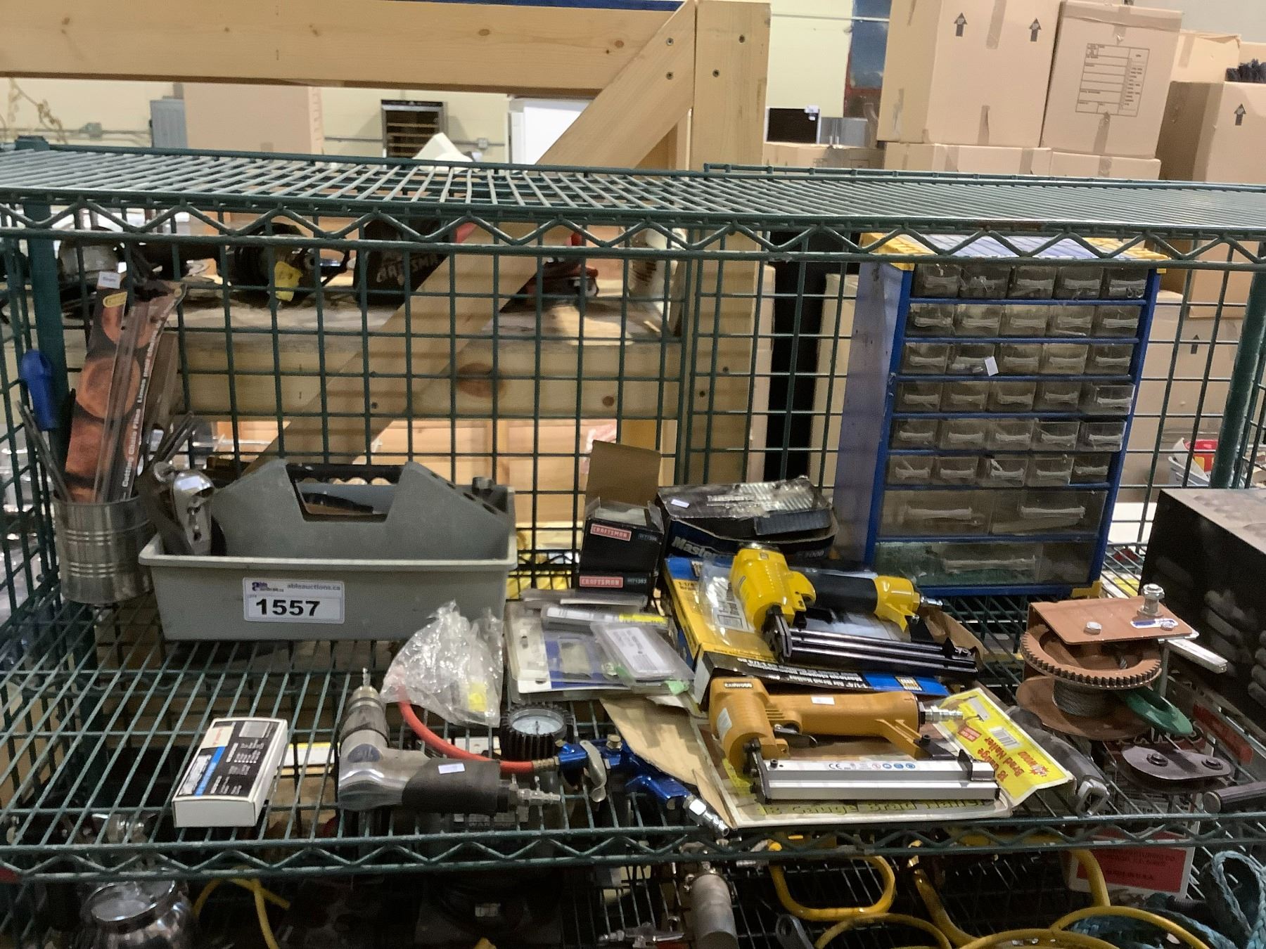 SHELF LOT OF ASSORTED NAIL GUNS, CONVERTER, ORGANIZER, AND MORE