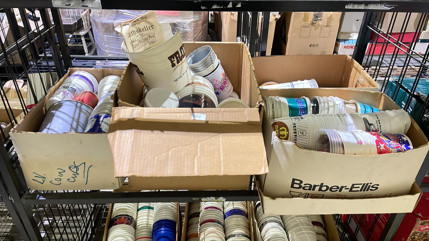 SHELF LOT OF ASSORTED PLASTIC CUPS AND MORE