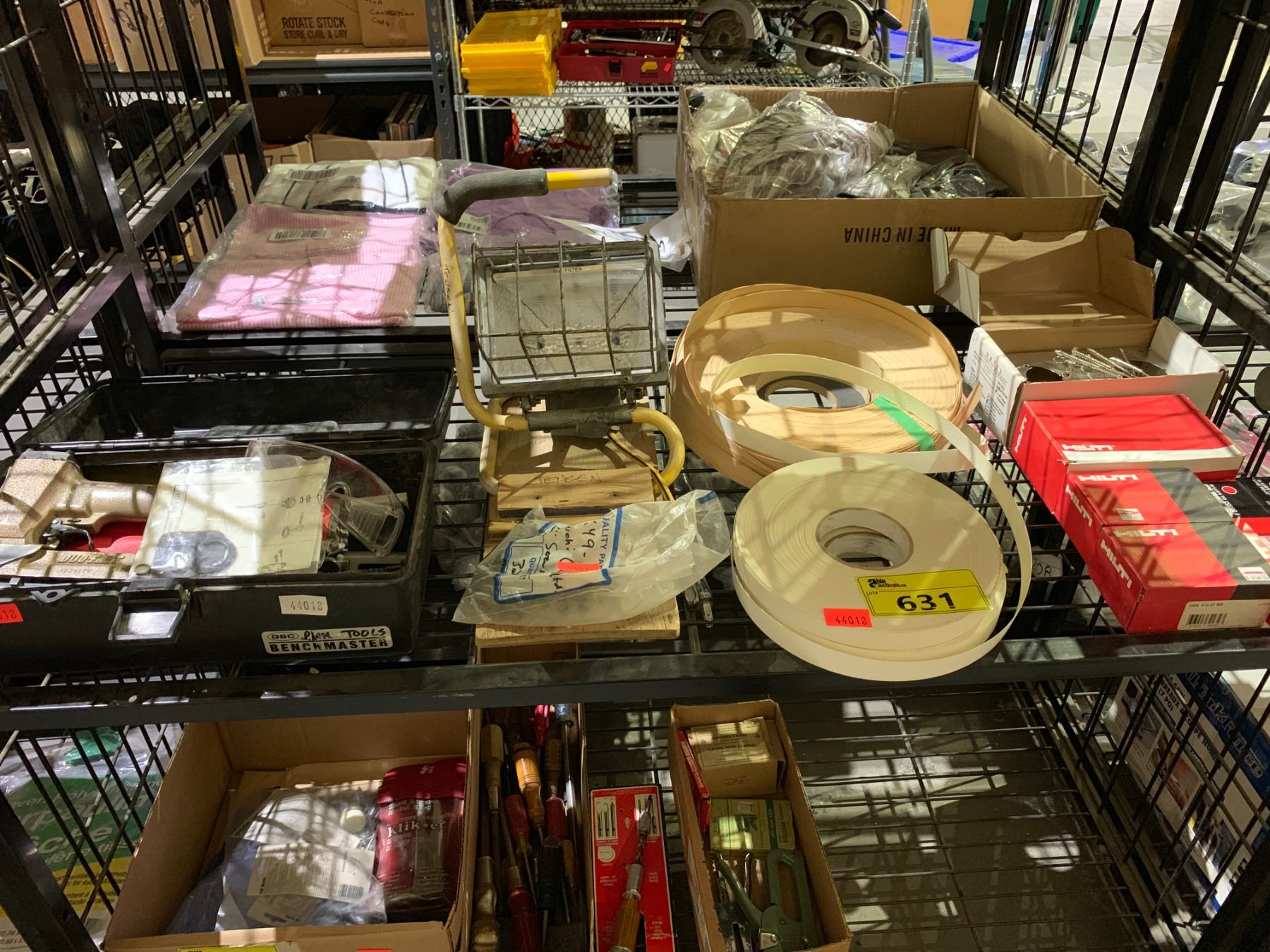 SHELF LOT OF ASSORTED TOOLS, WORK LIGHT AND MORE